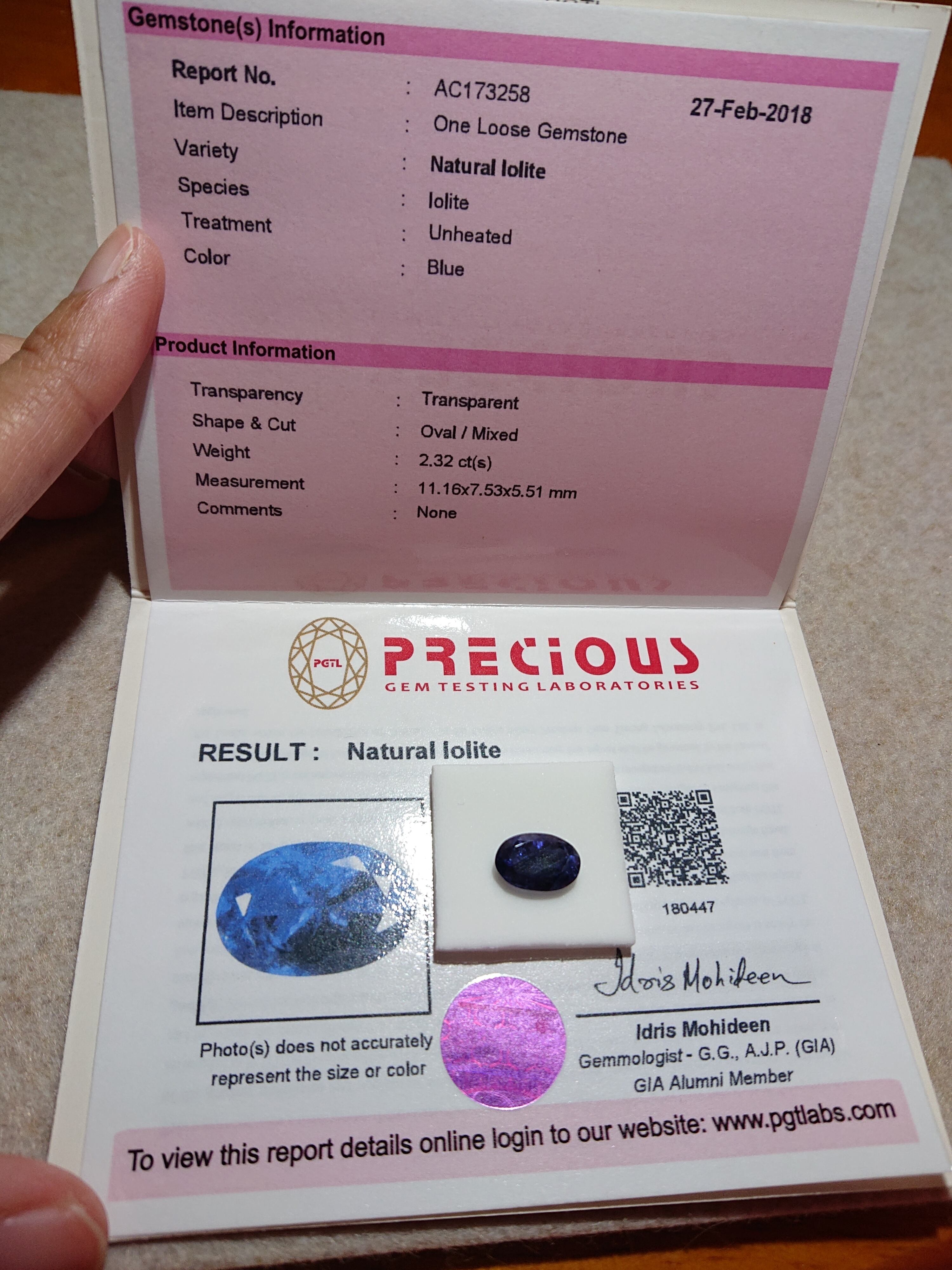 ペンダントトップ✨天然アイオライト 2.32ct ルース PGTL認定証付き✨