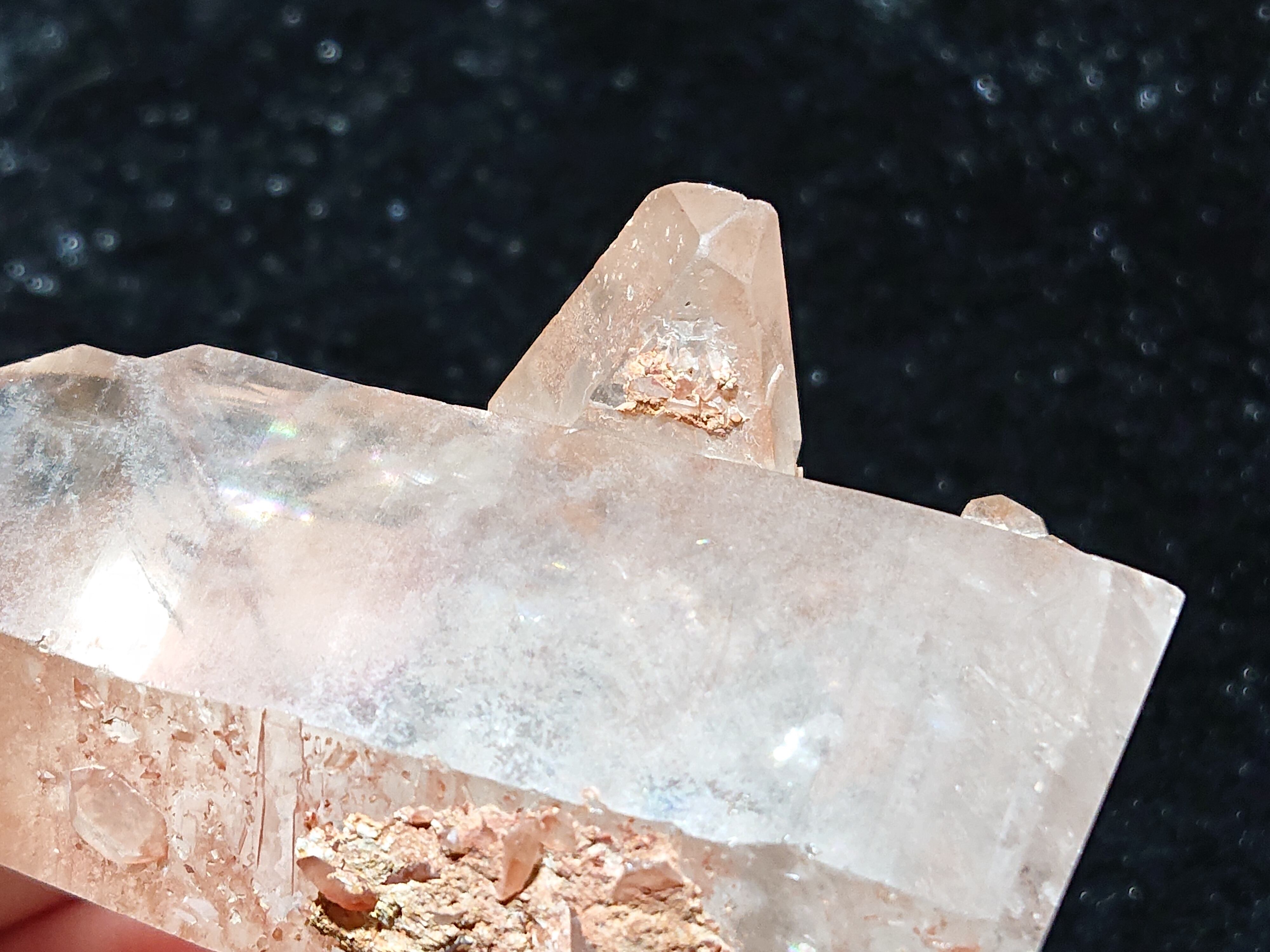 レムリアン水晶にかかせないレムリアンシードと呼ばれる筋模様だけでなく、バークナル、貫入(ブリッジ?)、レインボーも入っています。