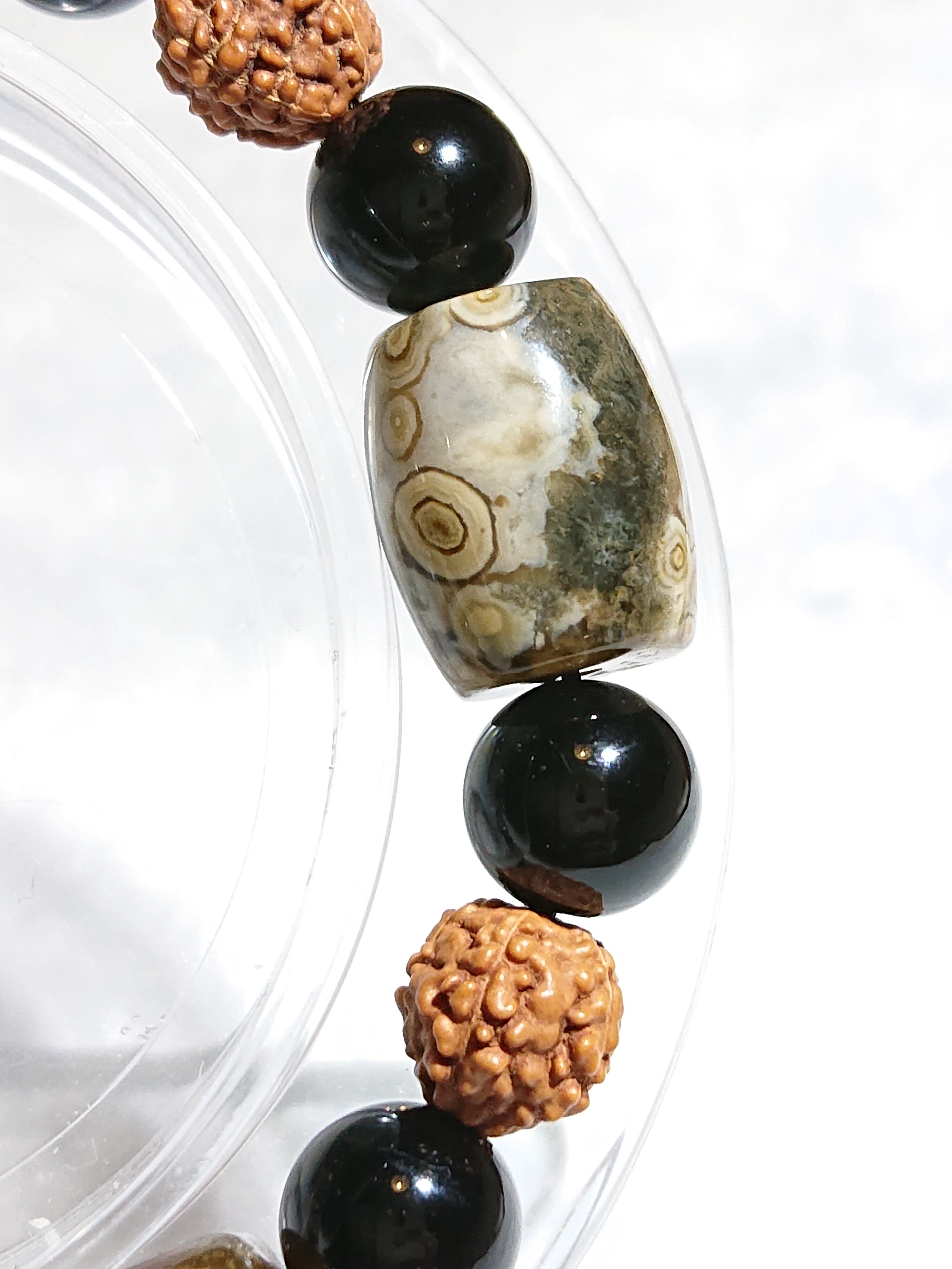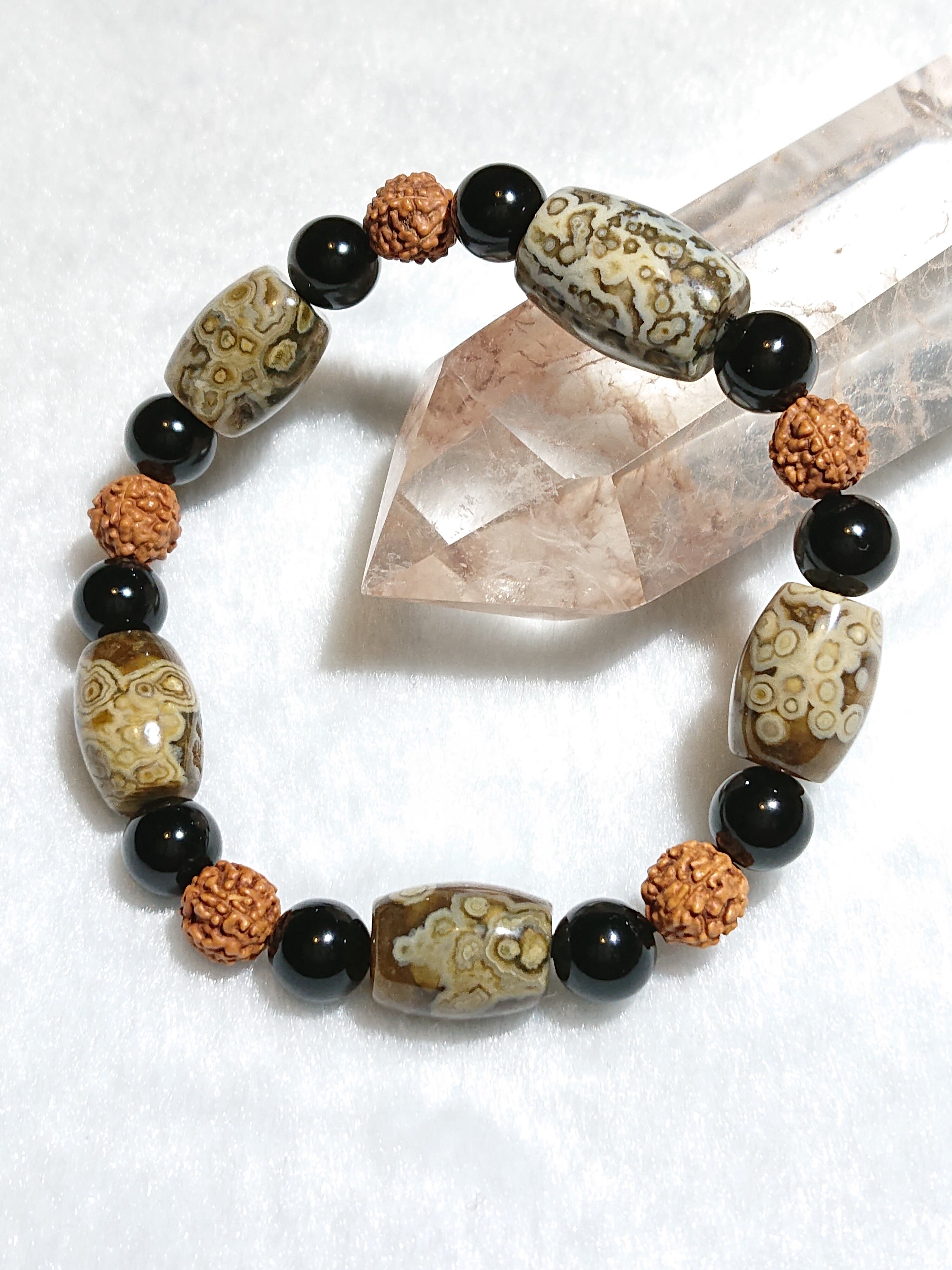 古代天珠(現代作成)、海洋碧玉(オーシャンジャスパー)、菩提樹の実(ルドラクシャ)、オニキス