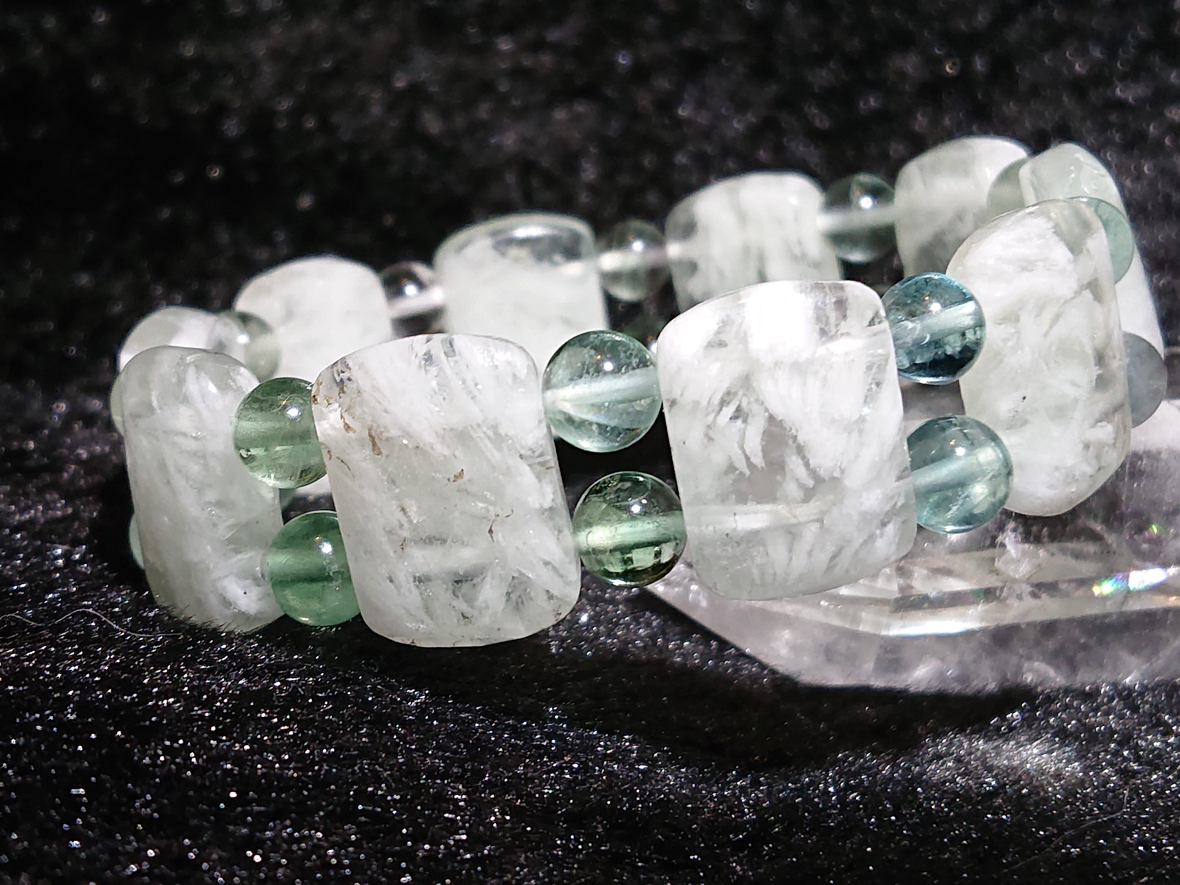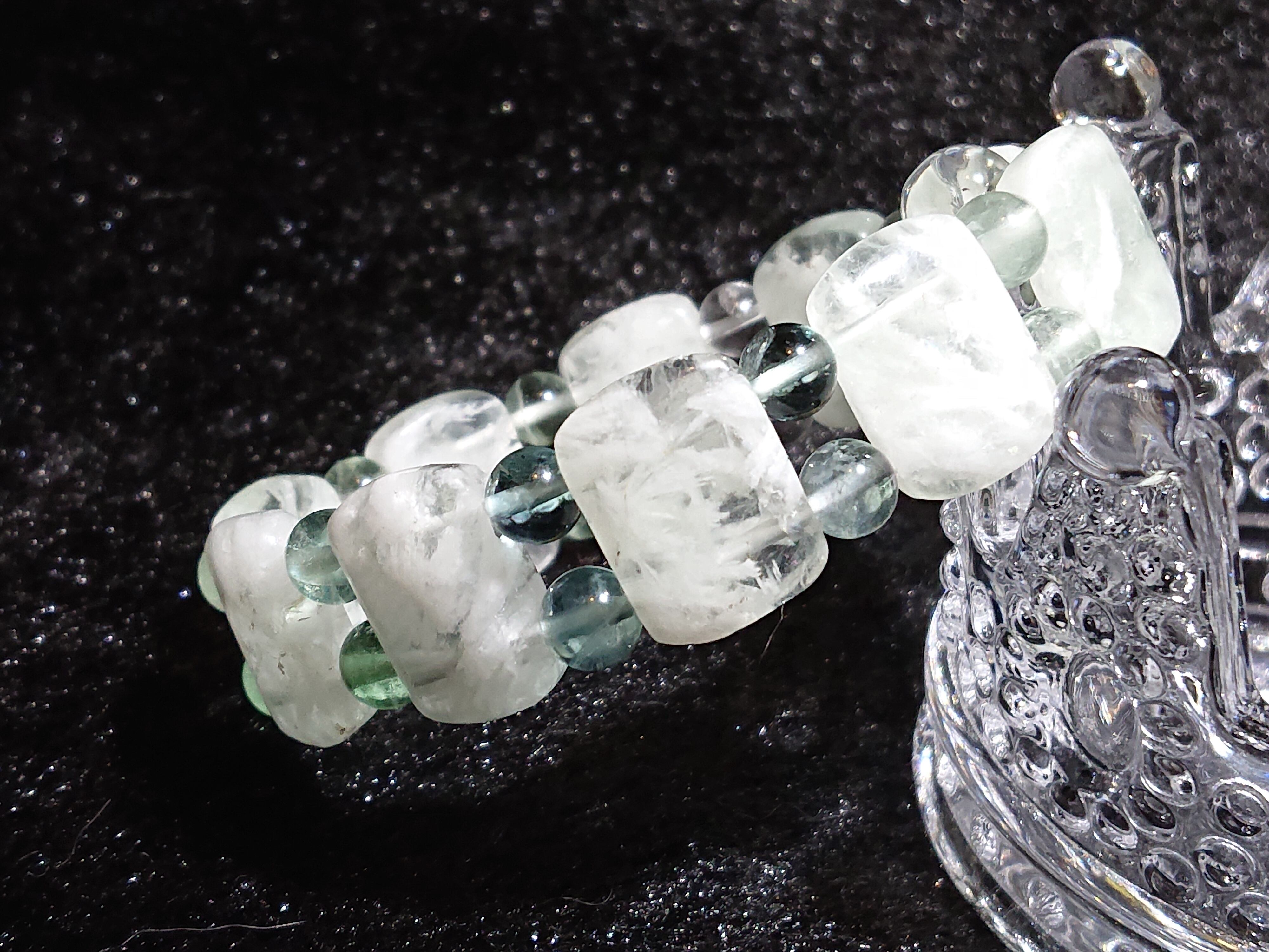 全てフローライトで合わせましたが、少し力が不安定だったので目立たぬようヒマラヤ水晶を2粒だけ組み込んで安定させました。