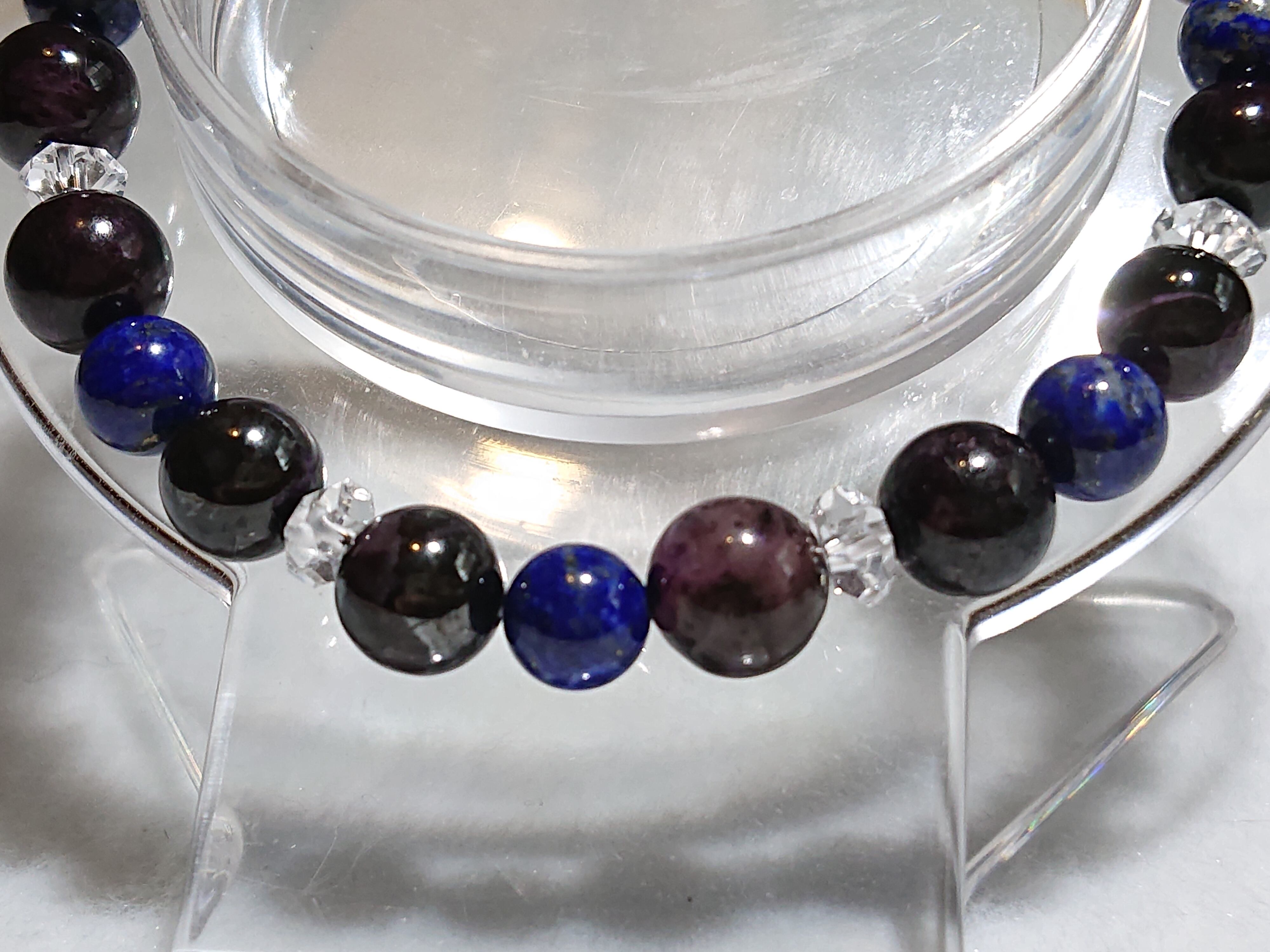ピンク、紫、黒系と様々な色の粒が一つになったスギライトブレスレットです。