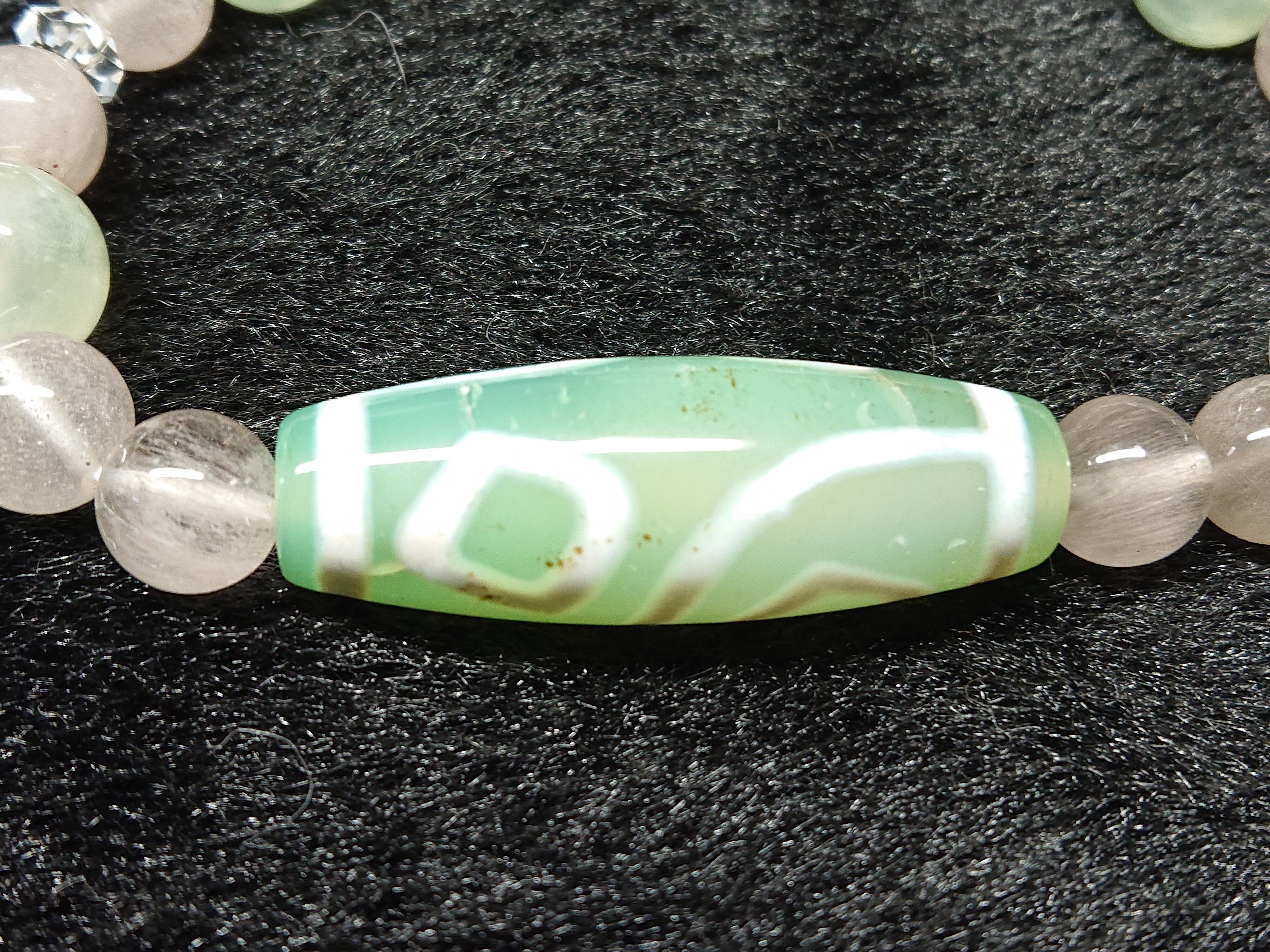希少な緑&朱砂入り❗四眼仏眼天珠(チベット老玉髄天珠・朱砂入り)、ラビットヘアーホワイトルチルクォーツ、プレナイト