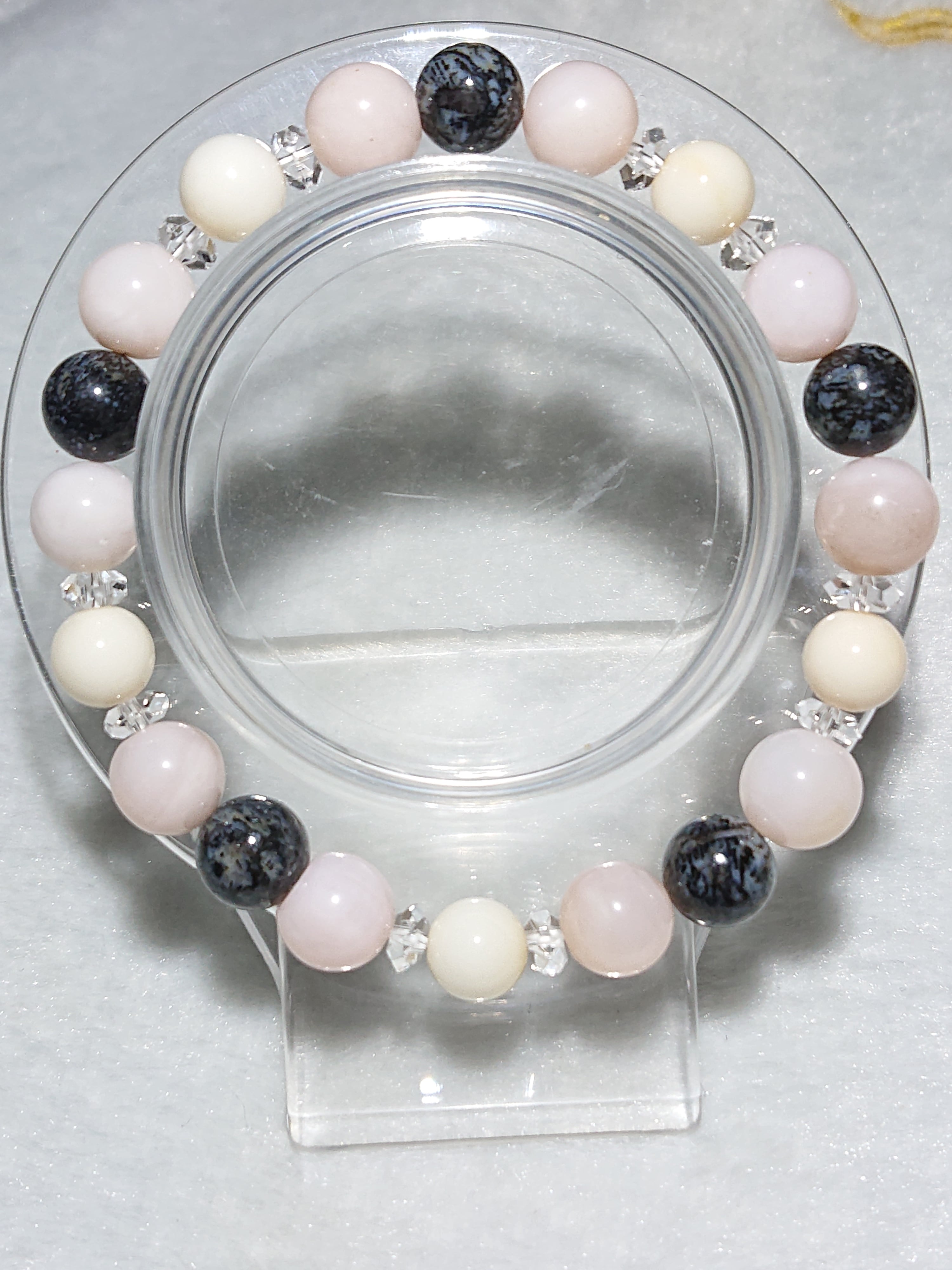 こちらのブレスレットはデンドリックアゲートとコモンオパールのみで組み合わており、白と黒のコントラストにピンクが入ることで柔らかな印象を感じさせます。