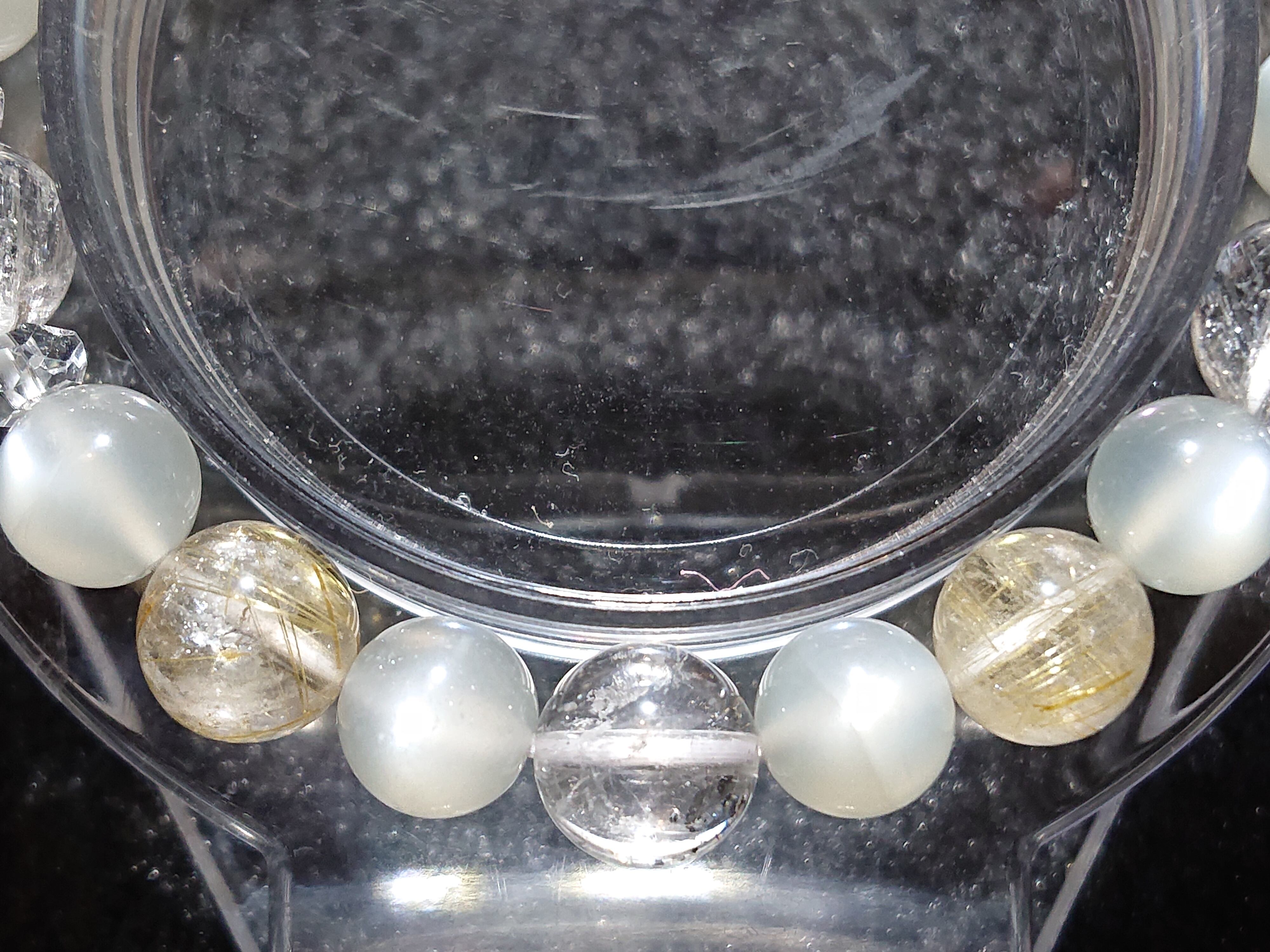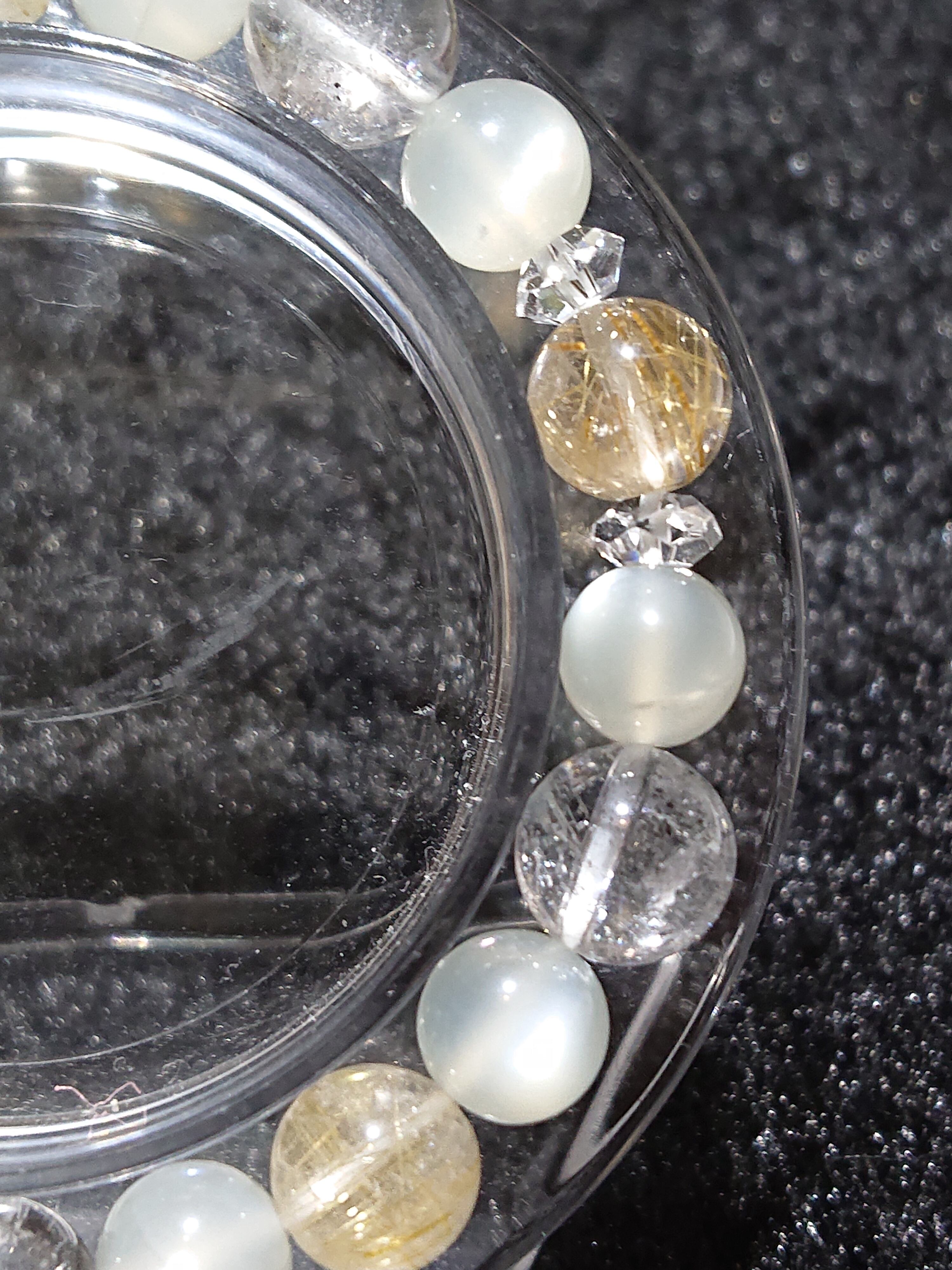 ムーンストーンは特に女性が持つと良いと言われており、そこにヒマラヤエレスチャルクォーツとルゴールドチルクォーツを組み合わせて感覚や金運アップを足してみました。