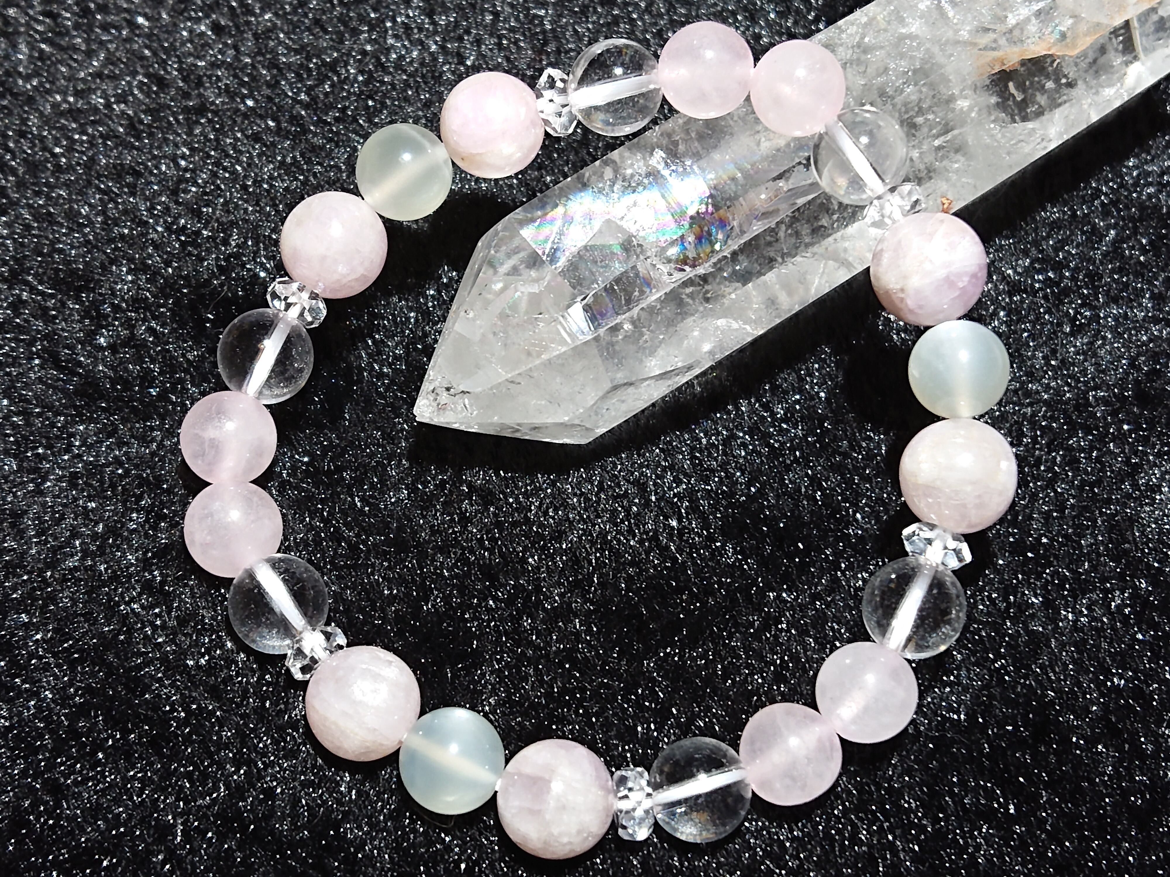女性が持つと良いとされるムーンストーンに、ミルキーなクンツァイトやローズクォーツを組み合わせ、愛らしくも品のあるイメージを込めて作成しました。