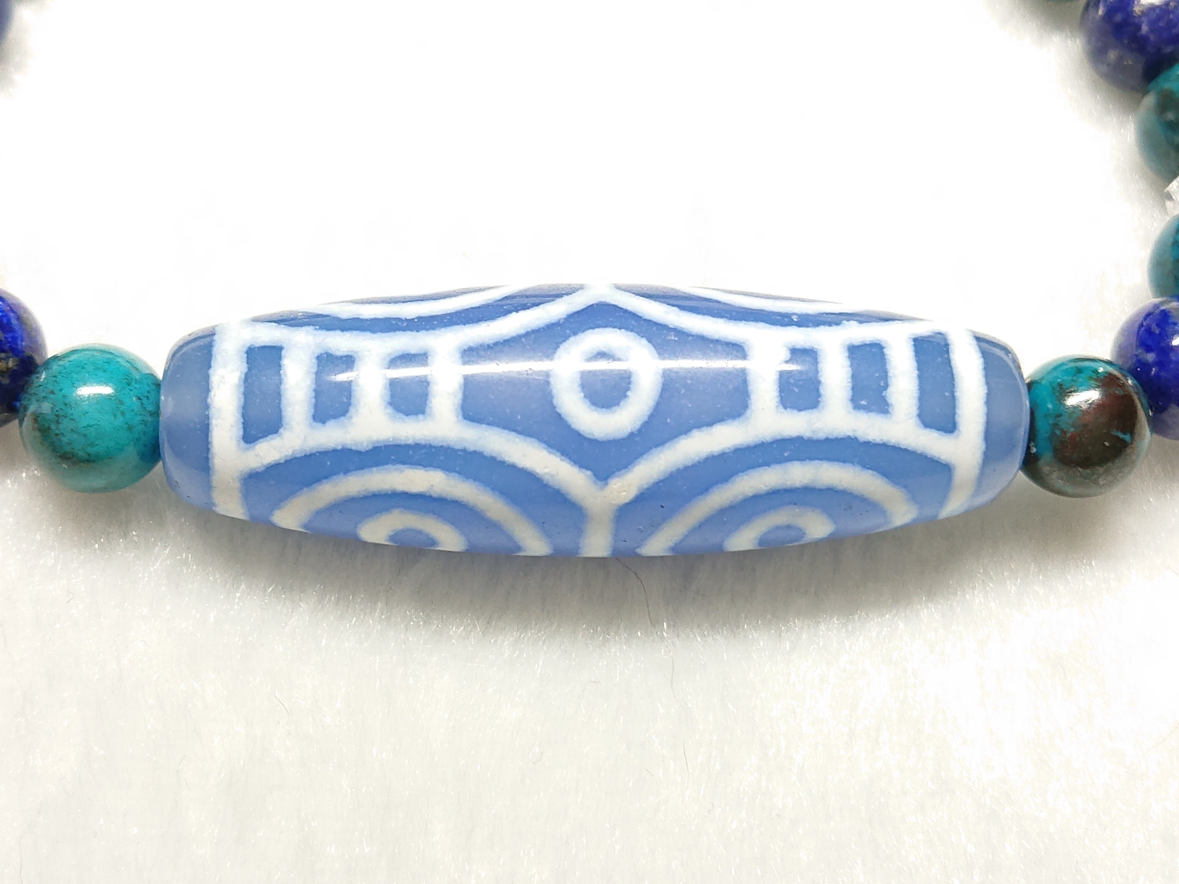 幸運と繁栄の青龍✨青・龍眼天珠(チベット老玉髄天珠)、ラピスラズリ、ブルークリソコラ、シナバー(辰砂)、水晶(ボタン)