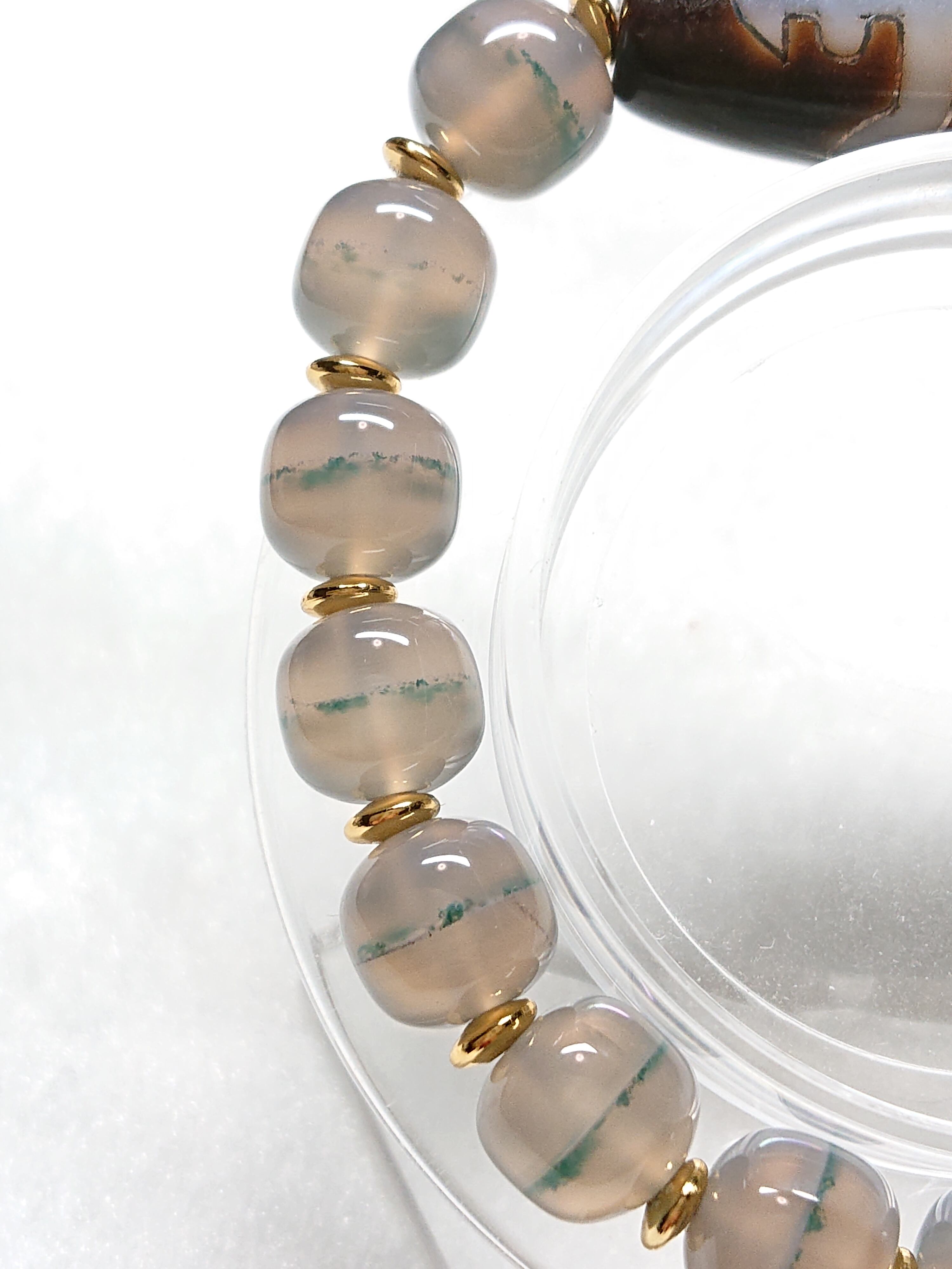 また、朱砂の入っている石は『チベット老玉髄天珠』と呼ばれるこちらも希少石で、触り心地はシットリとしていて、どこかとろみのある柔らかな感触です。