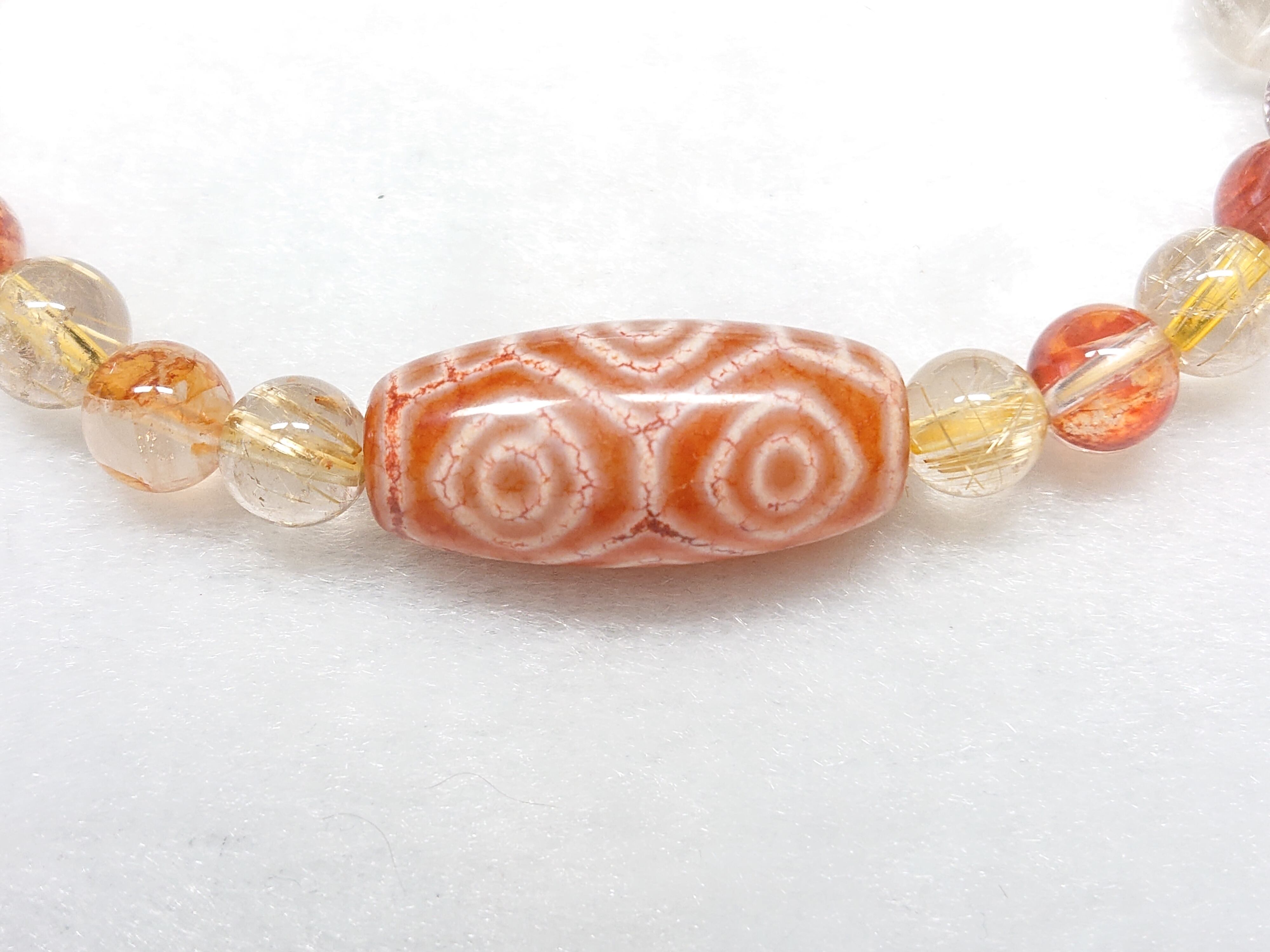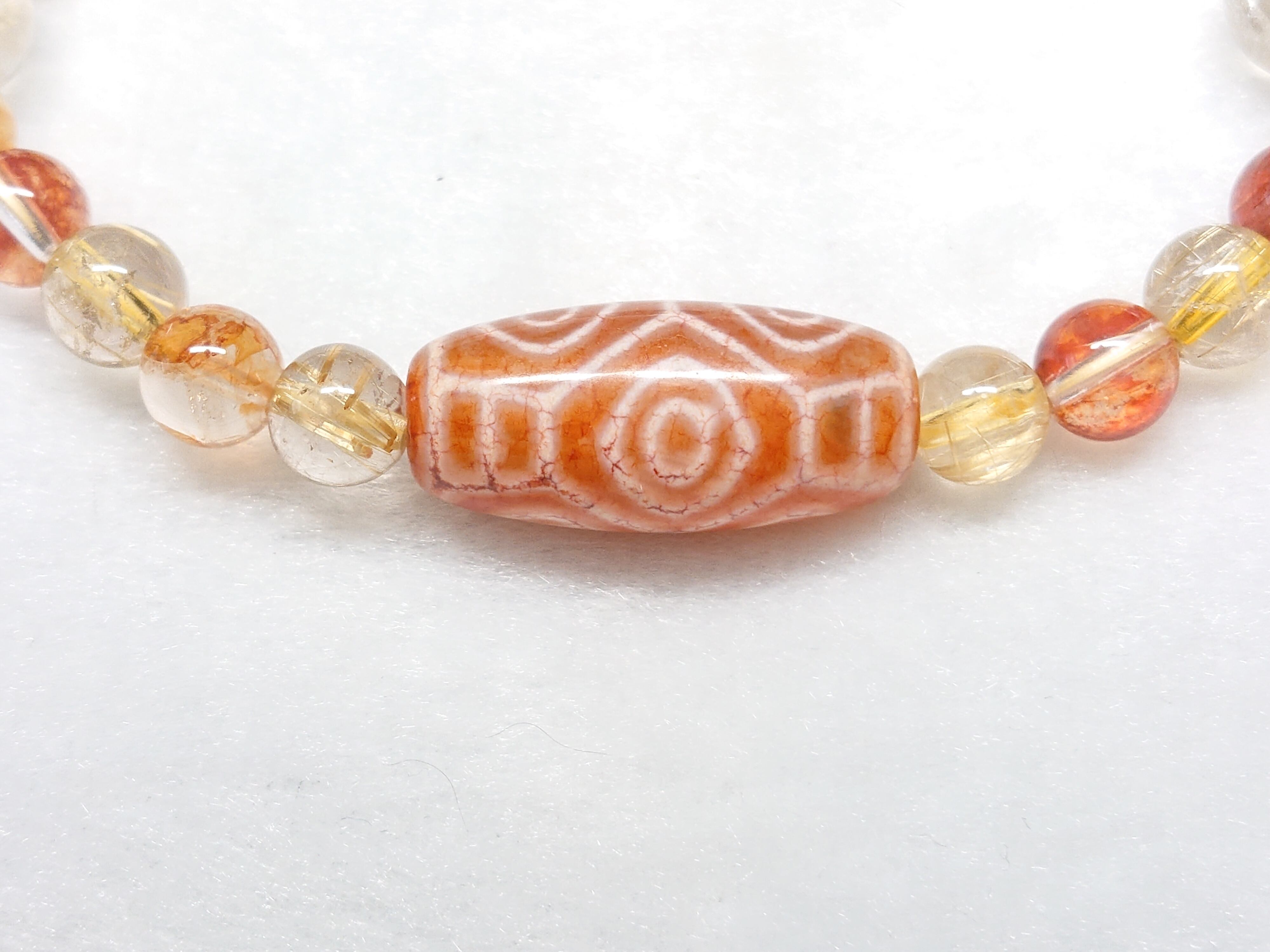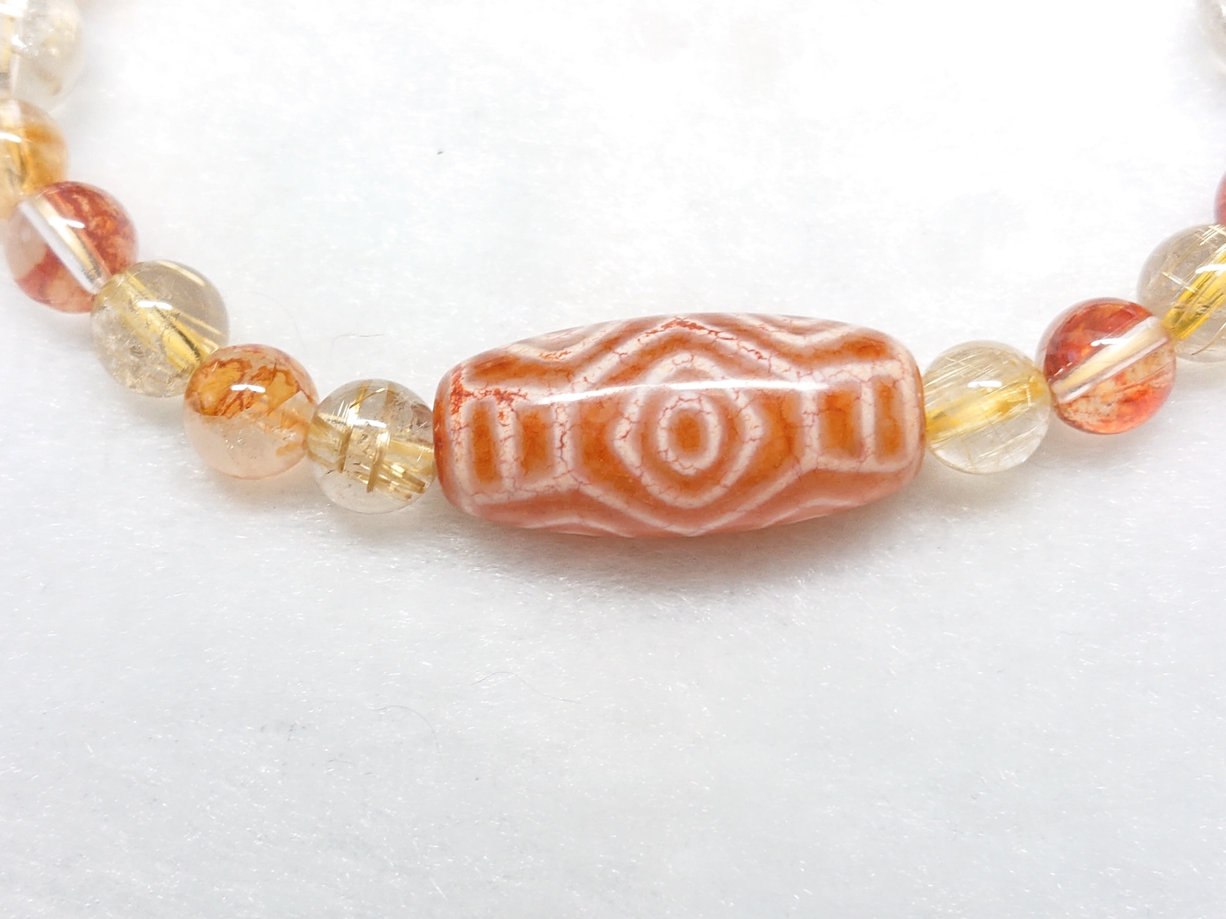 美しい龍紋✨橙・龍眼天珠(チベット老玉髄天珠)、ゴールドルチルクォーツ、シトリン(非加熱)、オーロラクォーツ(リモナイトインクォーツ)、シナバー(辰砂)、水晶(ボタン)
