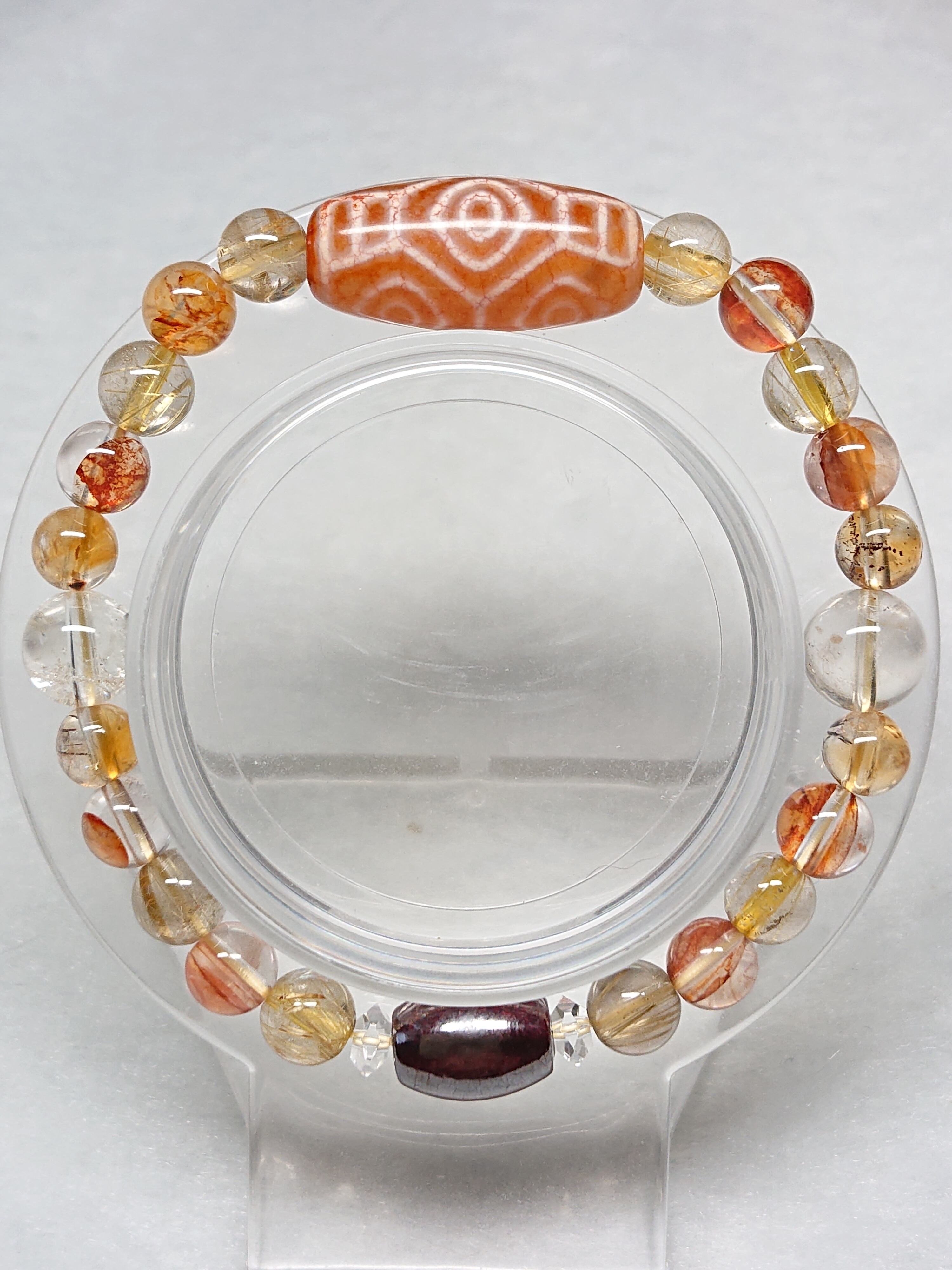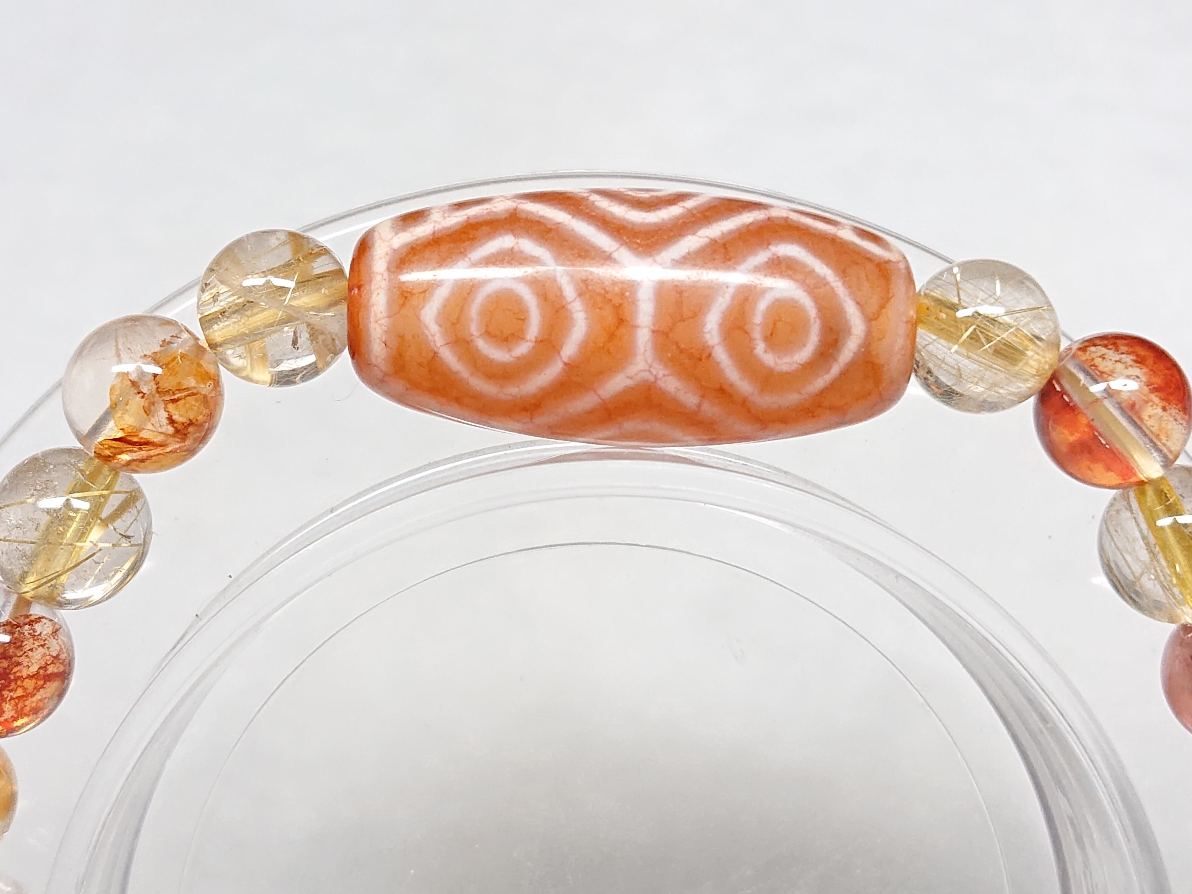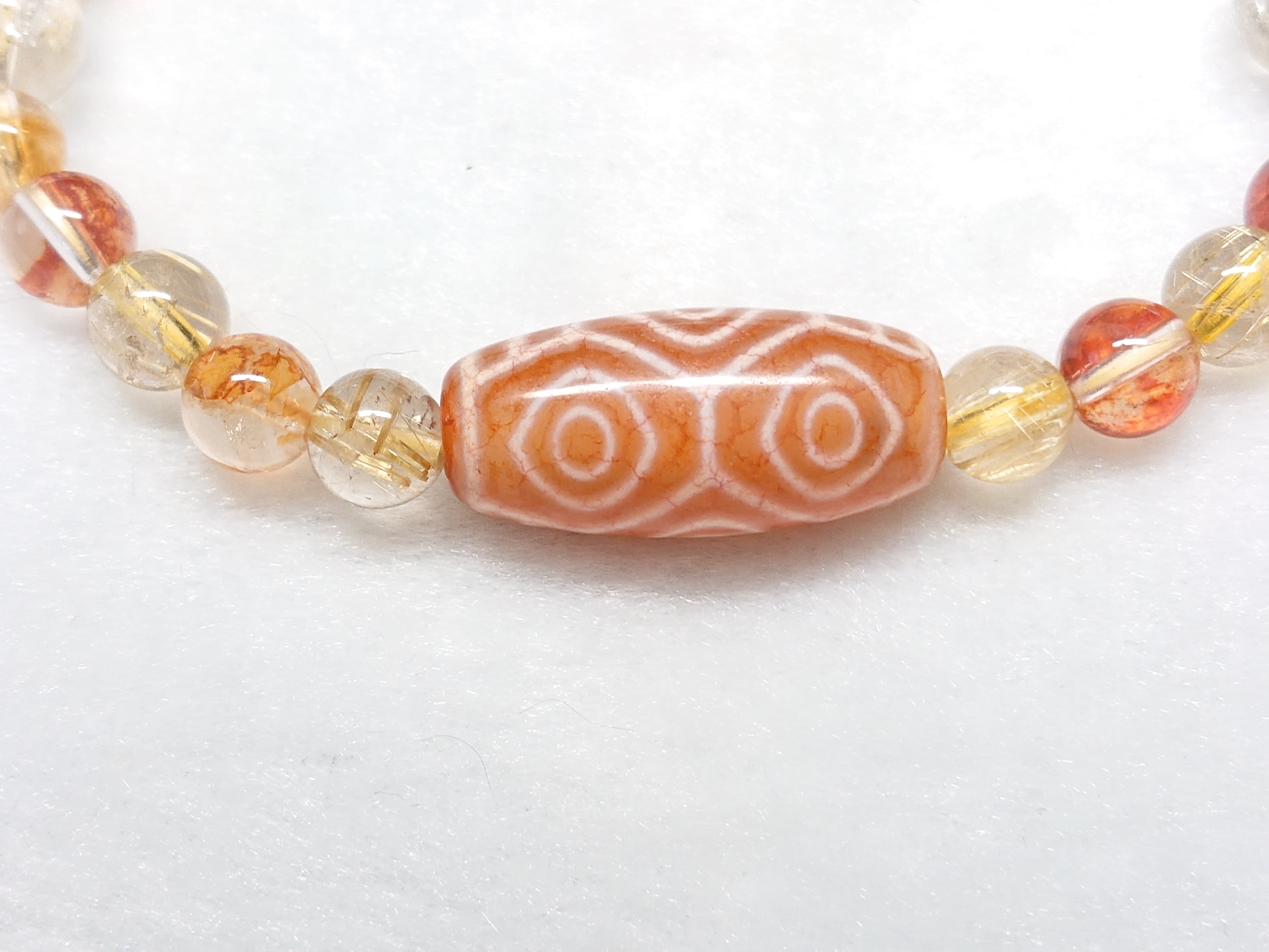 美しい龍紋✨橙・龍眼天珠(チベット老玉髄天珠)、ゴールドルチルクォーツ、シトリン(非加熱)、オーロラクォーツ(リモナイトインクォーツ)、シナバー(辰砂)、水晶(ボタン)