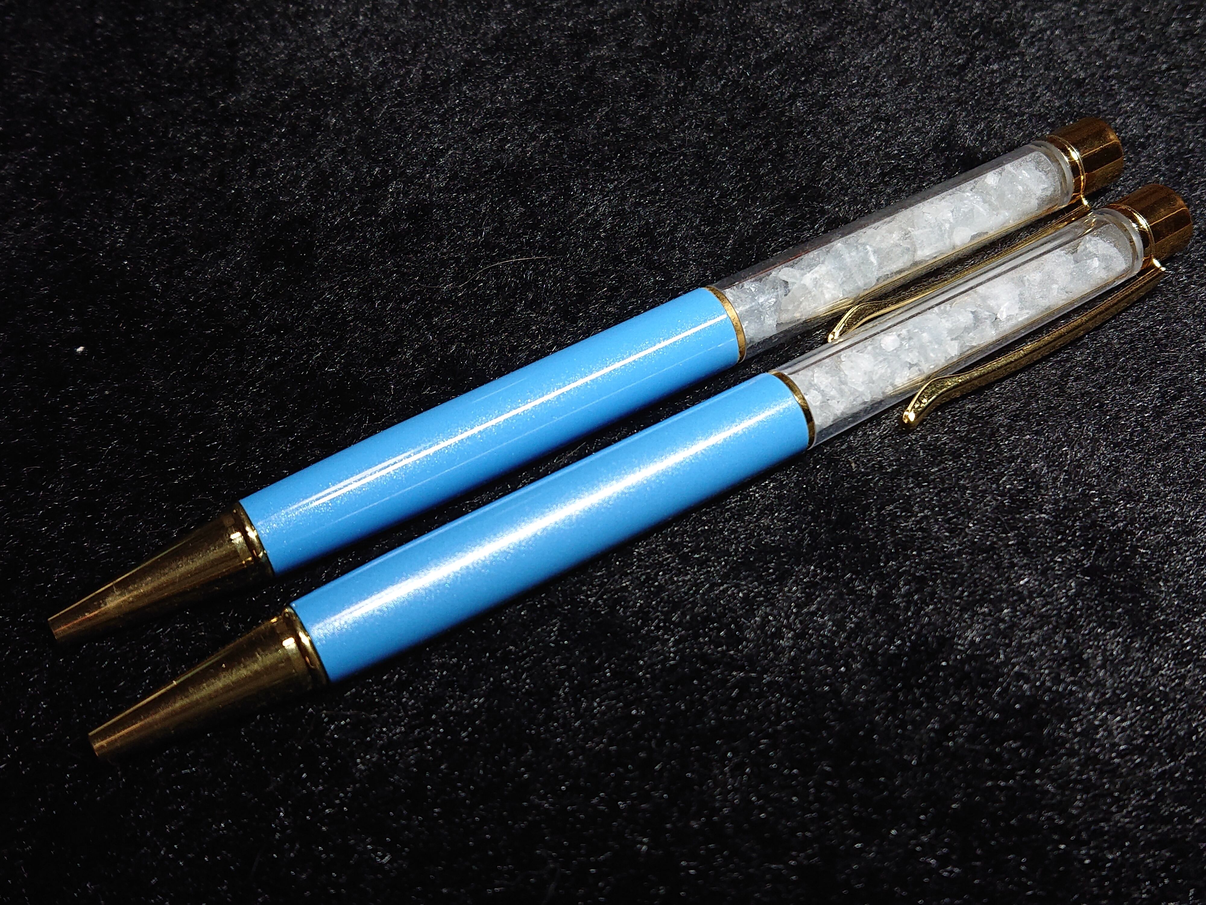 こちらは浄化作用が強いと言われるセレスタイトのクラスターを入れたボールペンになります。