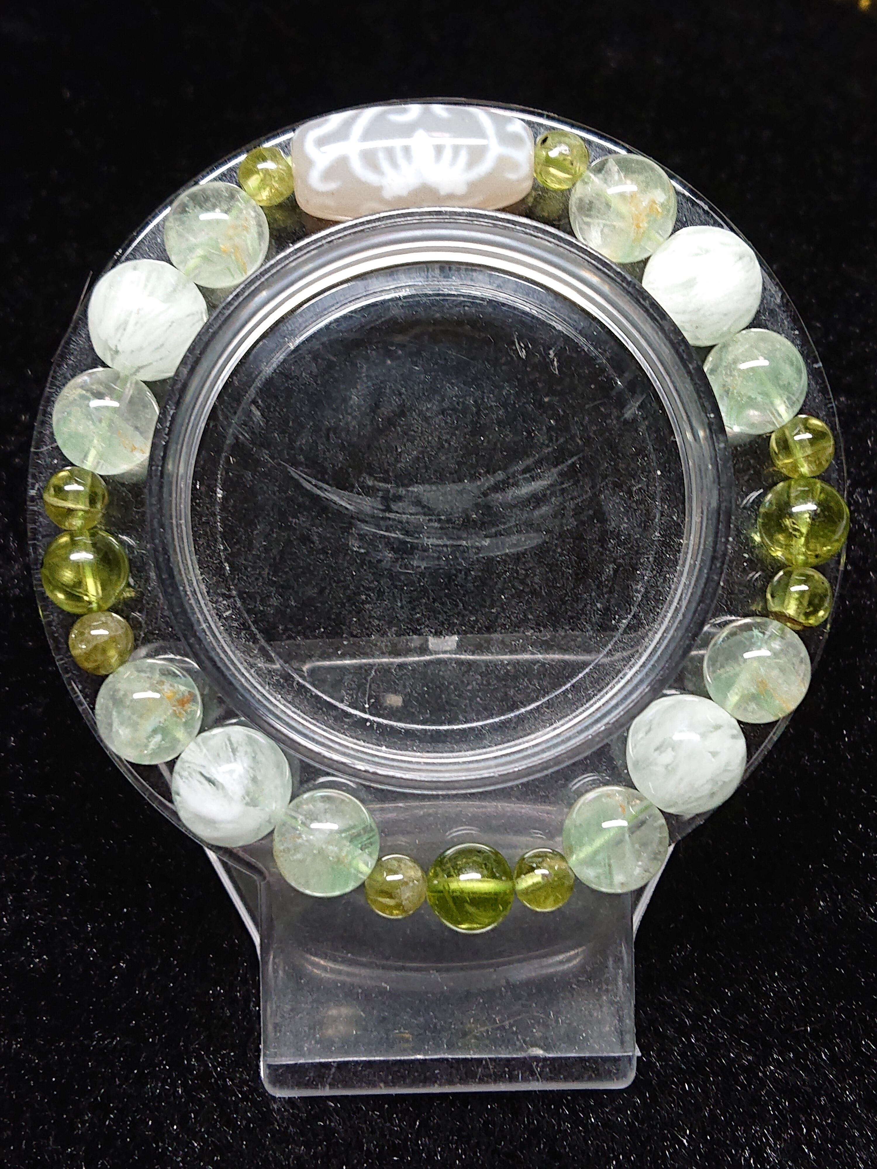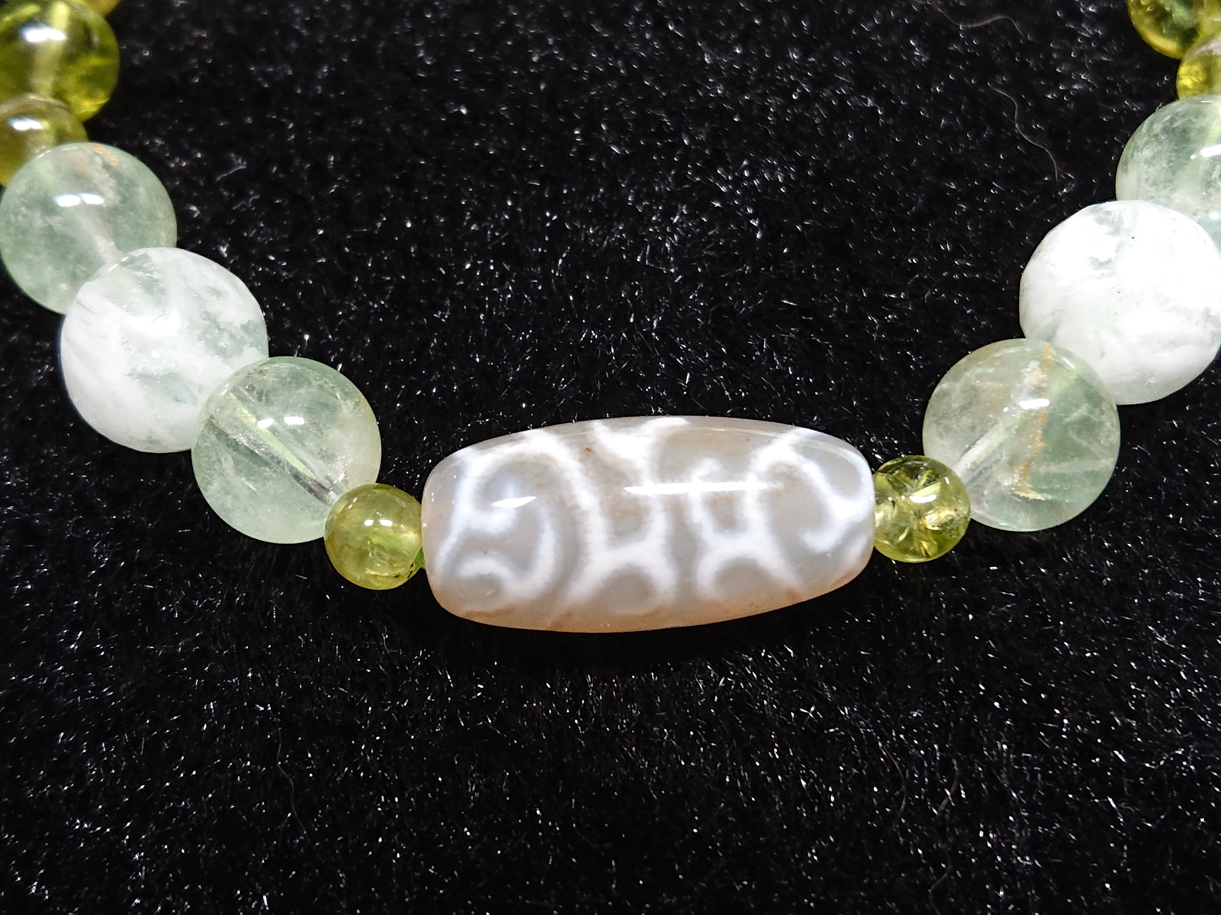 緑光の蓮(成長への羽ばたき)✨白・如意蓮花天珠(チベット老玉髄天珠)、エンジェルフェザー イン フローライト、ペリドット、グリーンファントムクォーツ