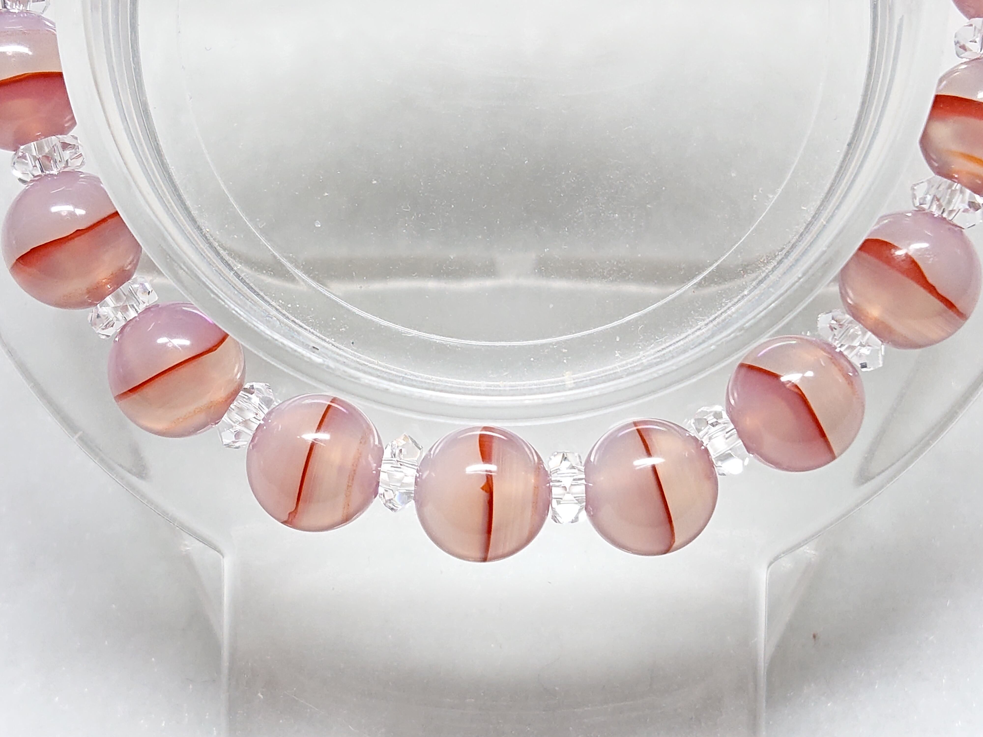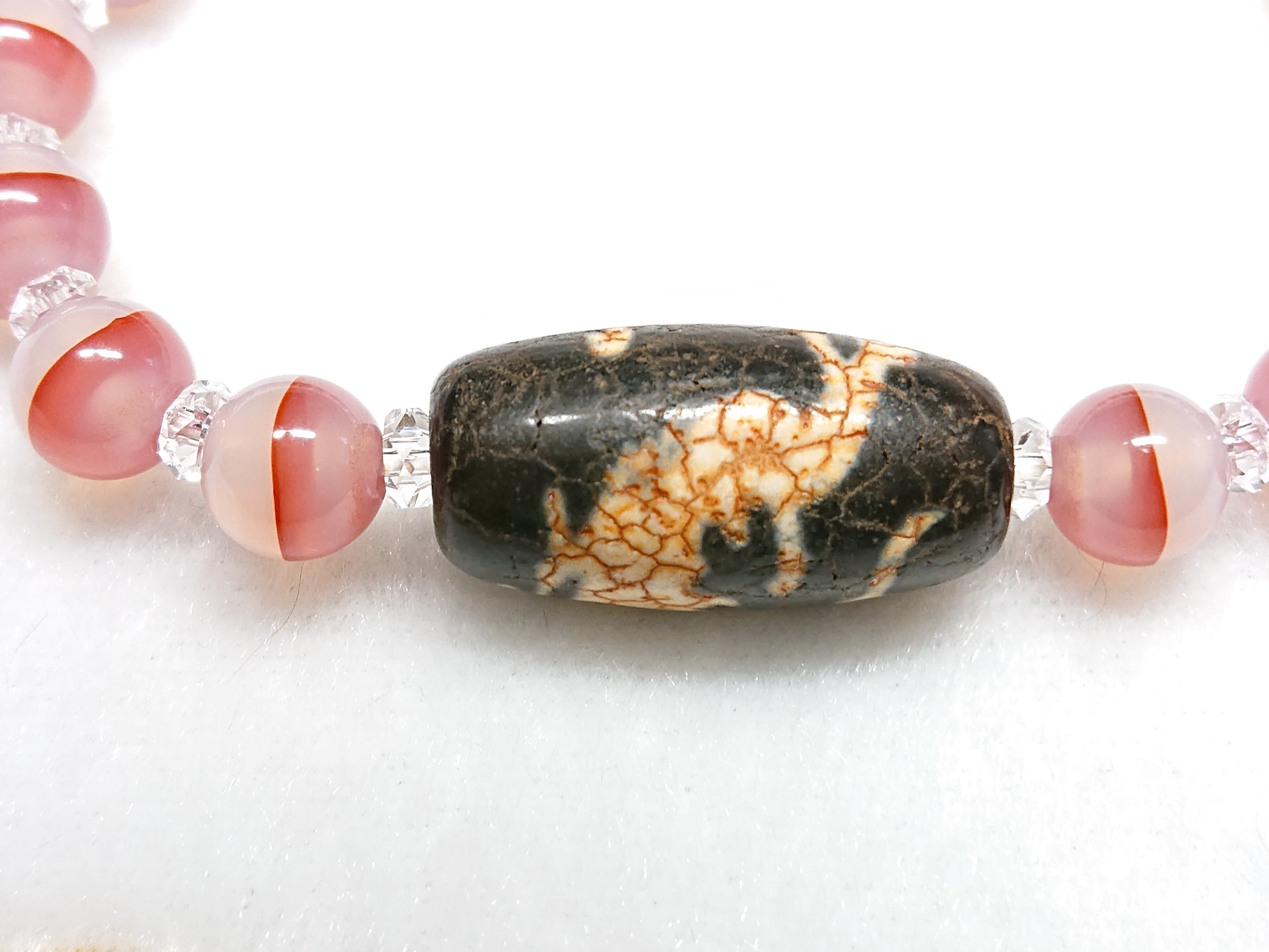 また、朱砂の入っている石は『チベット老玉髄天珠』と呼ばれるこちらも希少石で、触り心地はシットリとしていて、どこかとろみのある柔らかな感触です。