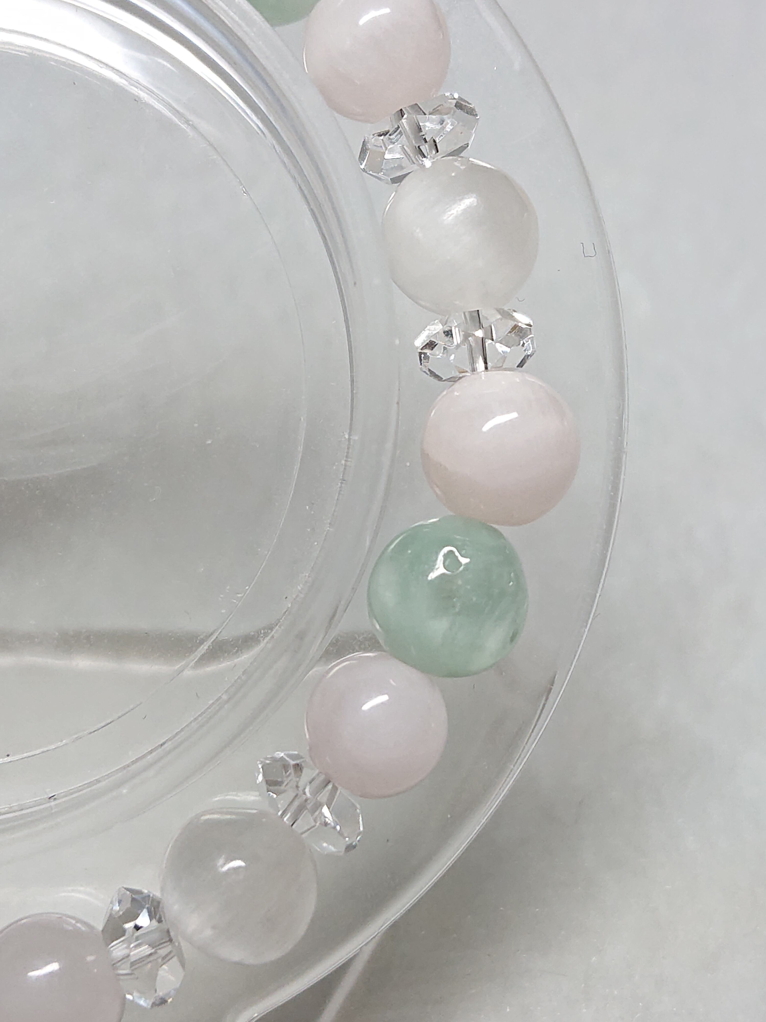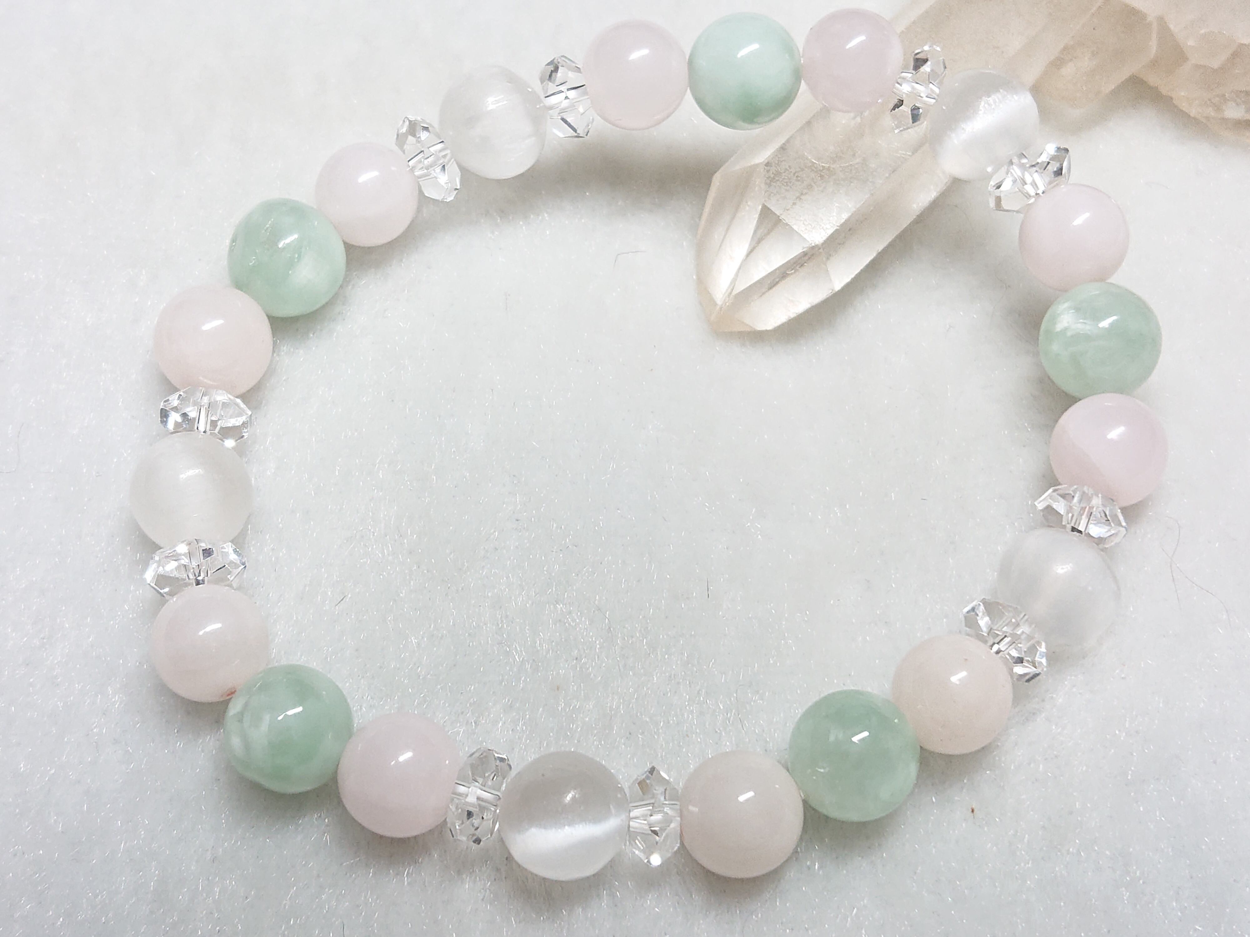 癒しの力✨グリーンエンジェライト、ピンクマンガンカルサイト(ピンクコバルトカルサイト)、キャッツアイセレナイト、水晶(ボタン)