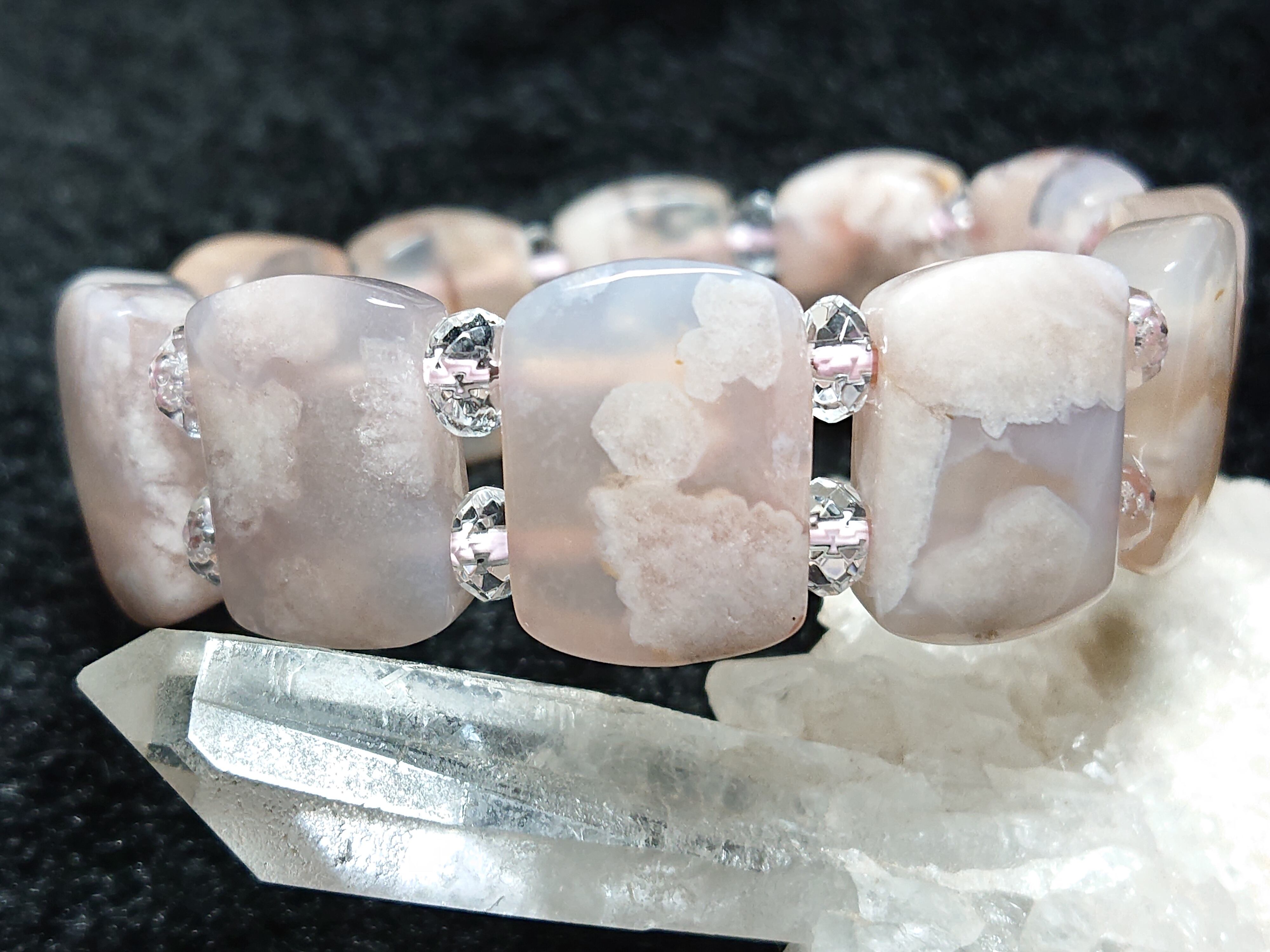 桜に水滴✨桜瑪瑙(チェリーブロッサムアゲート)、水晶(ボタン) バングル