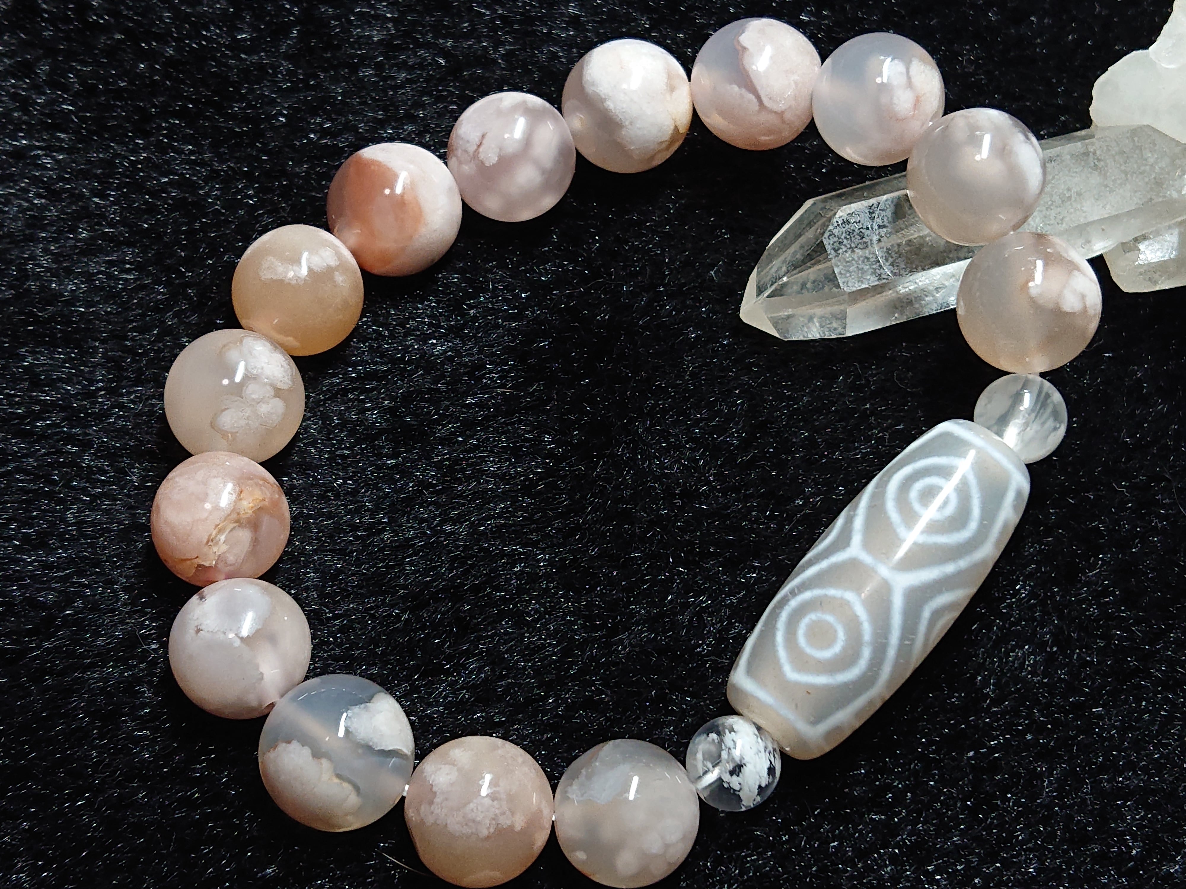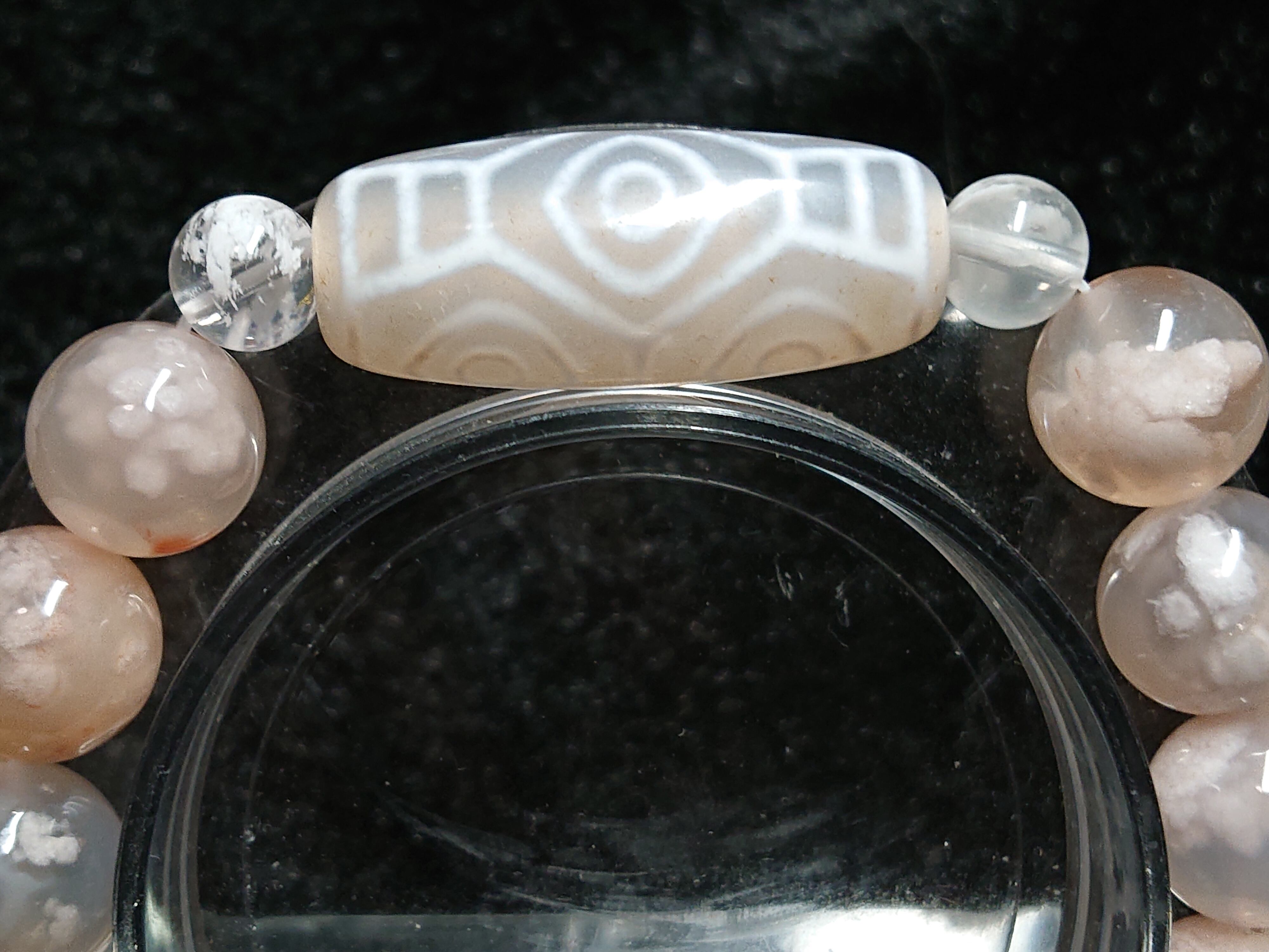 桜花爛漫 笑龍✨白・龍眼天珠(チベット老玉髄天珠)、セリサイト イン クォーツ、桜瑪瑙(チェリーブロッサムアゲート)