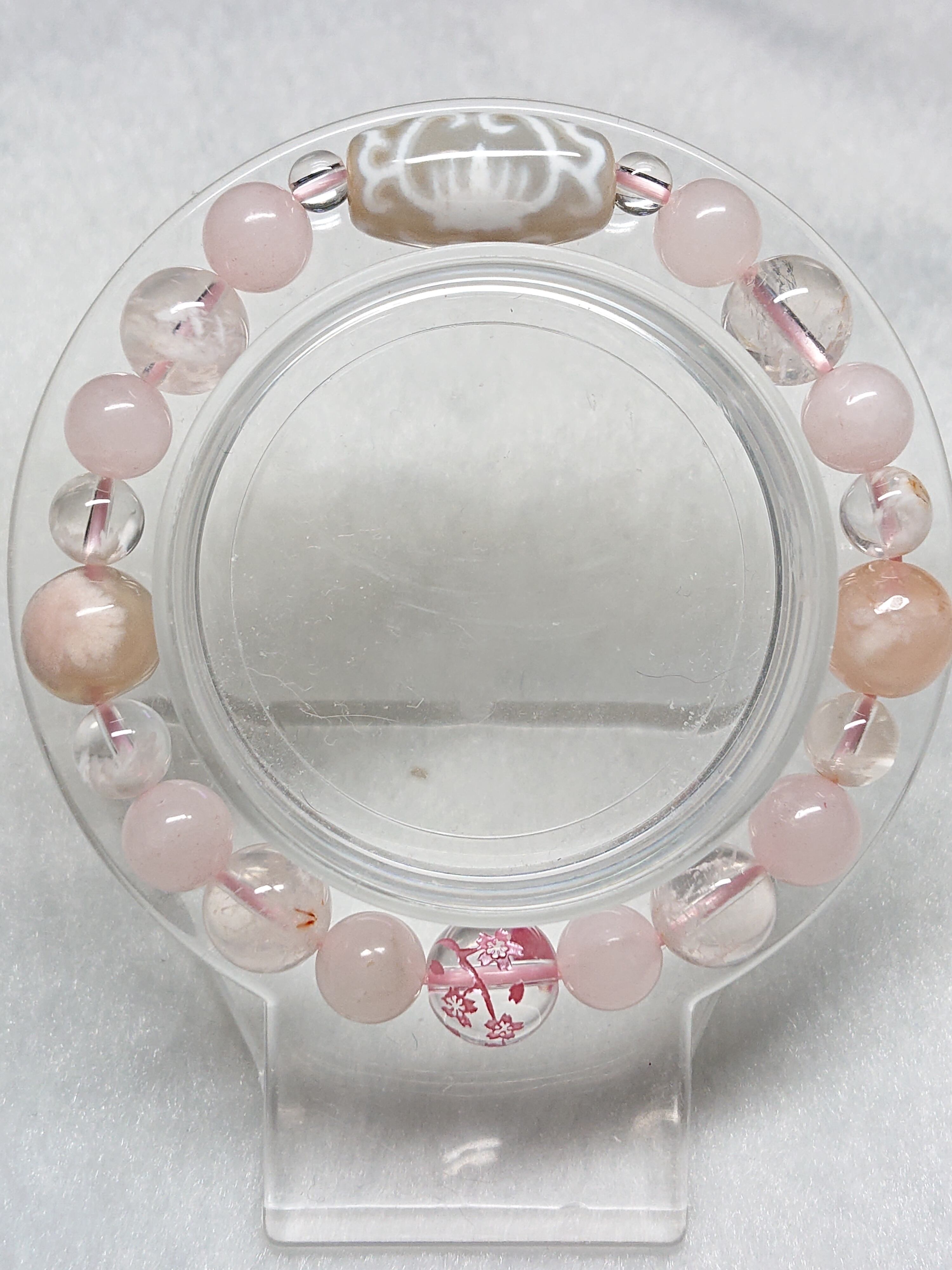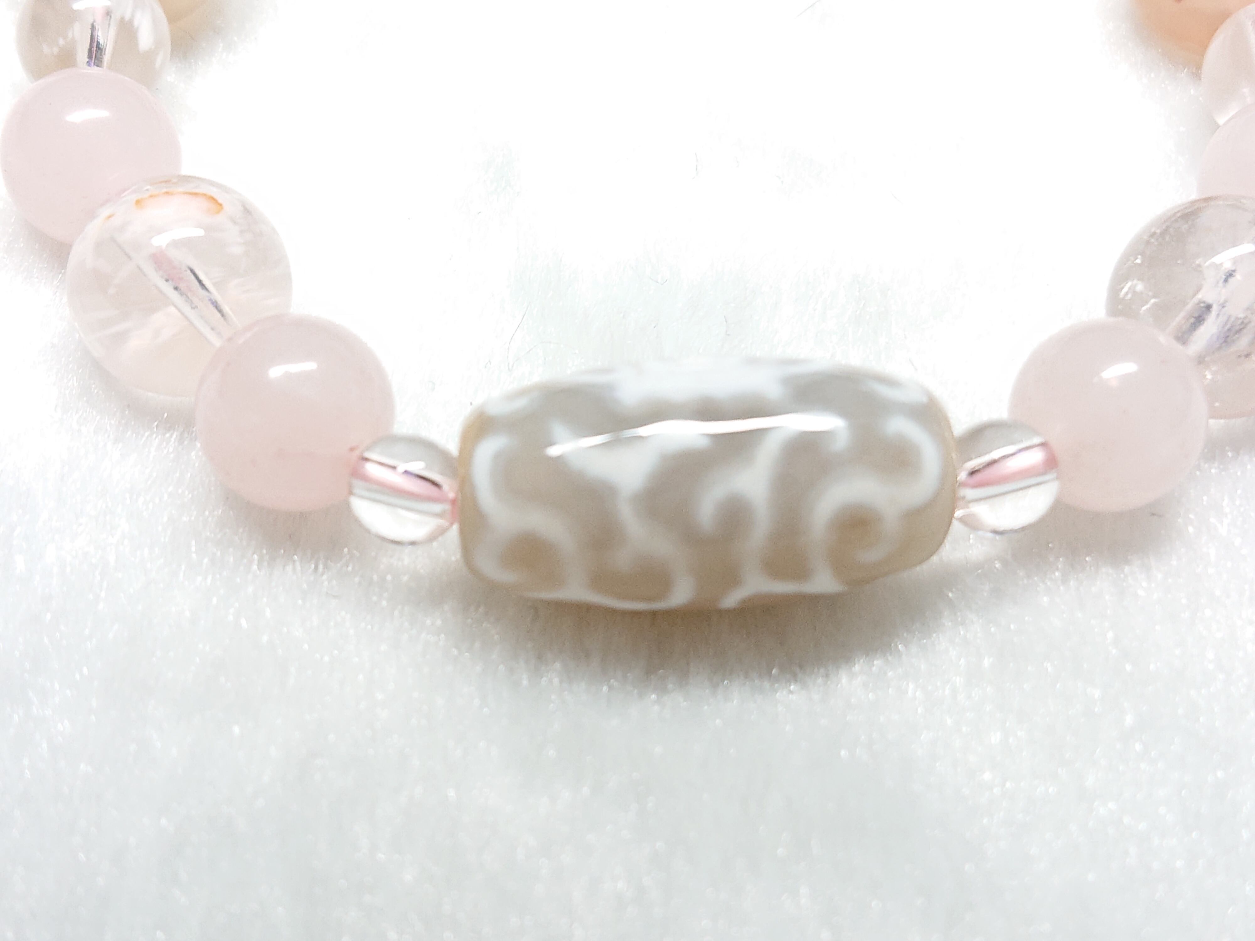 桜色ブレスレット✨白・如意蓮花天珠(チベット老玉髄天珠)、桜瑪瑙(チェリーブロッサムアゲート)、セリサイトインローズクォーツ、セリサイトインクォーツ、ピンクマンガンカルサイト、水晶(桜彫り)