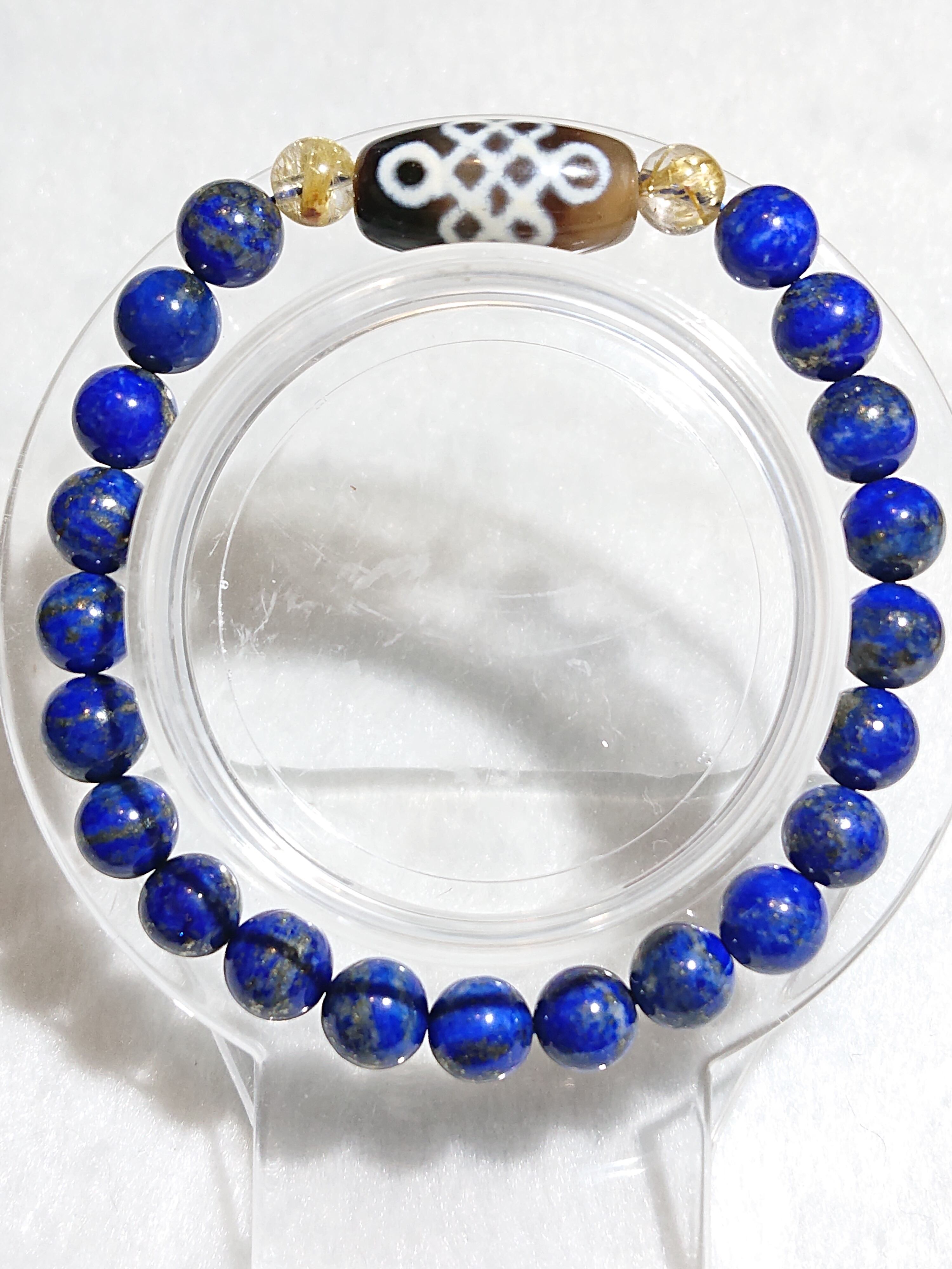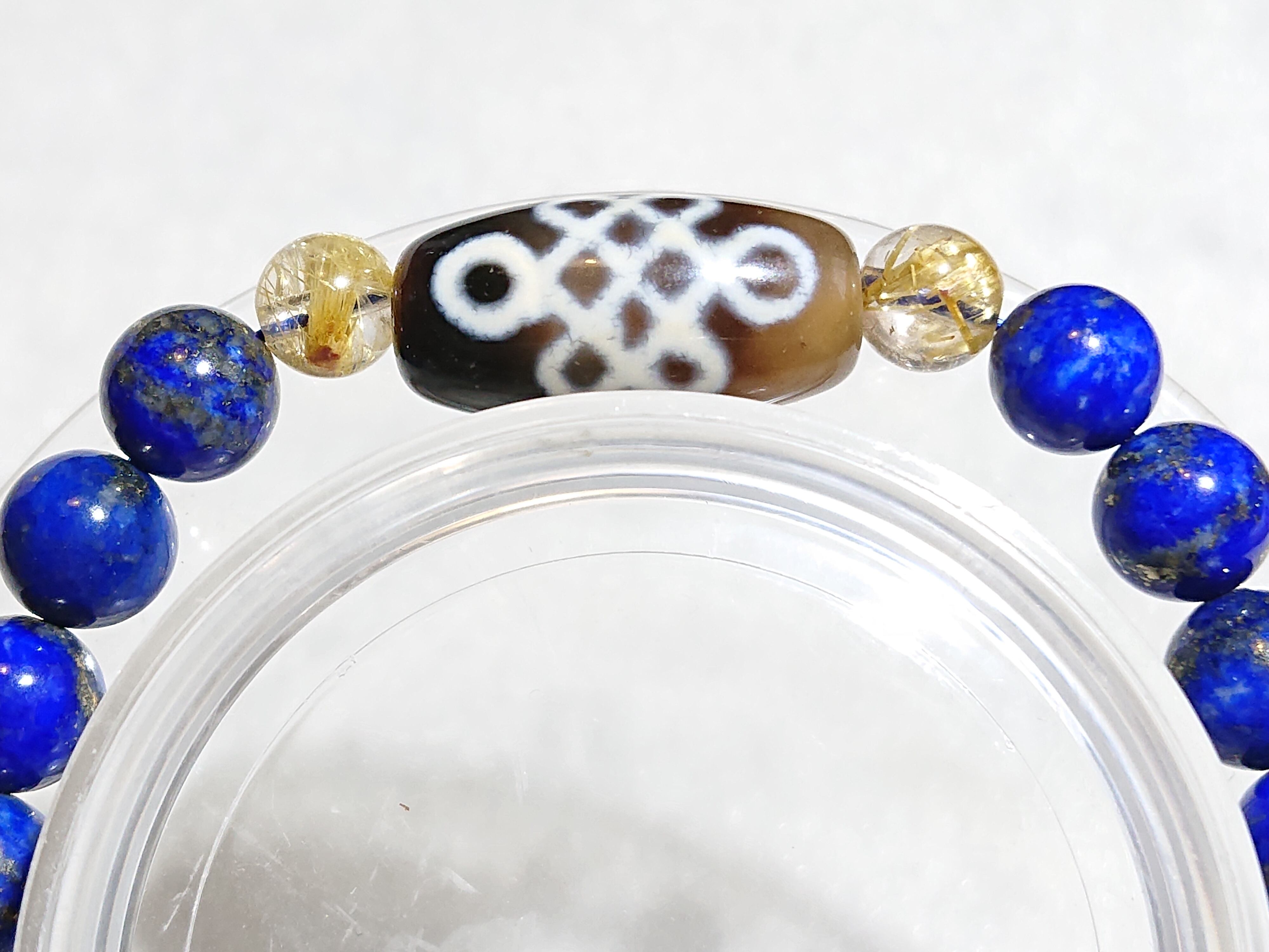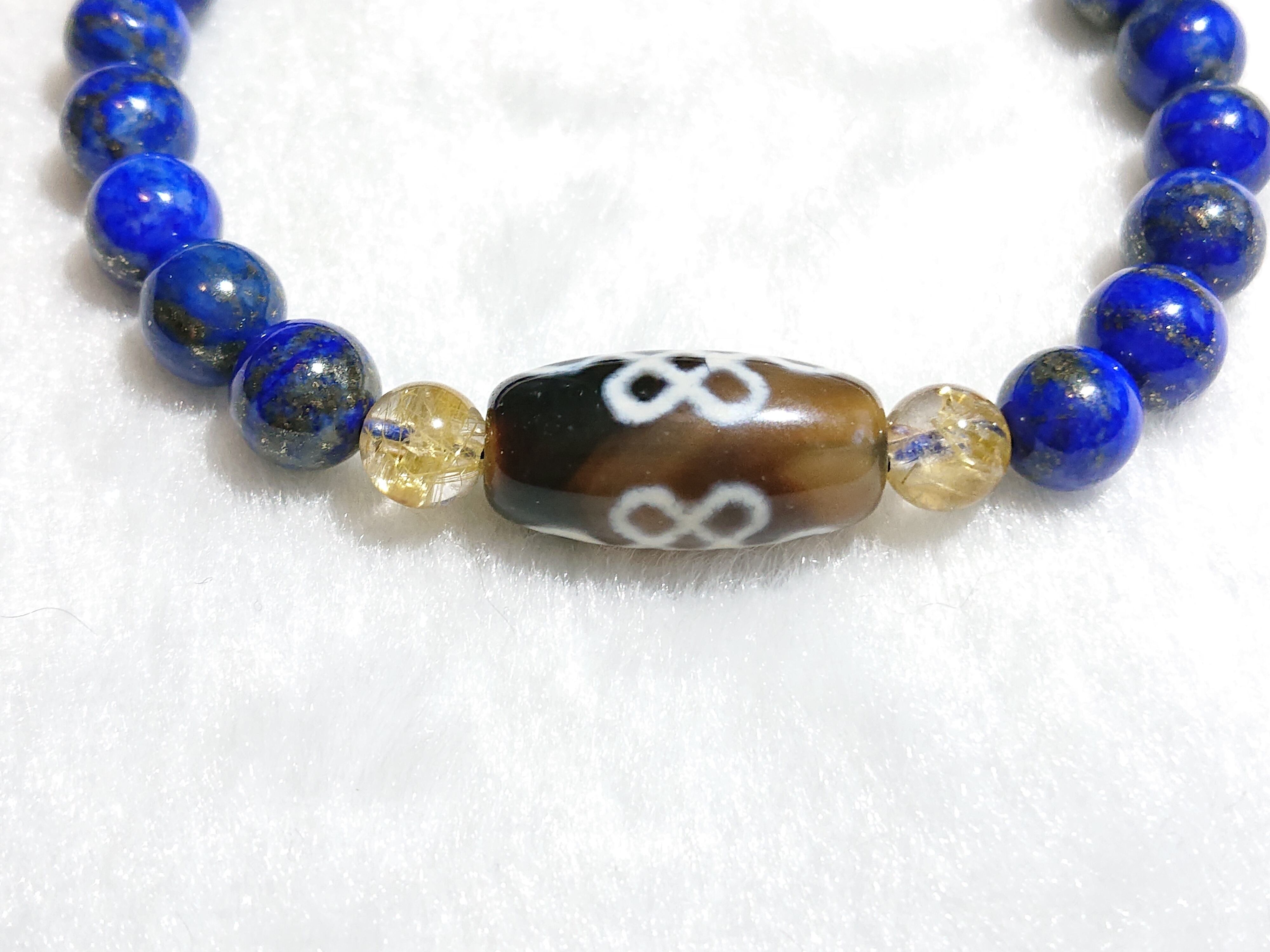 吉祥文様✨エンドレスノット天珠(チベット老玉髄天珠)、太陽タイチンルチルクォーツ、ラピスラズリ