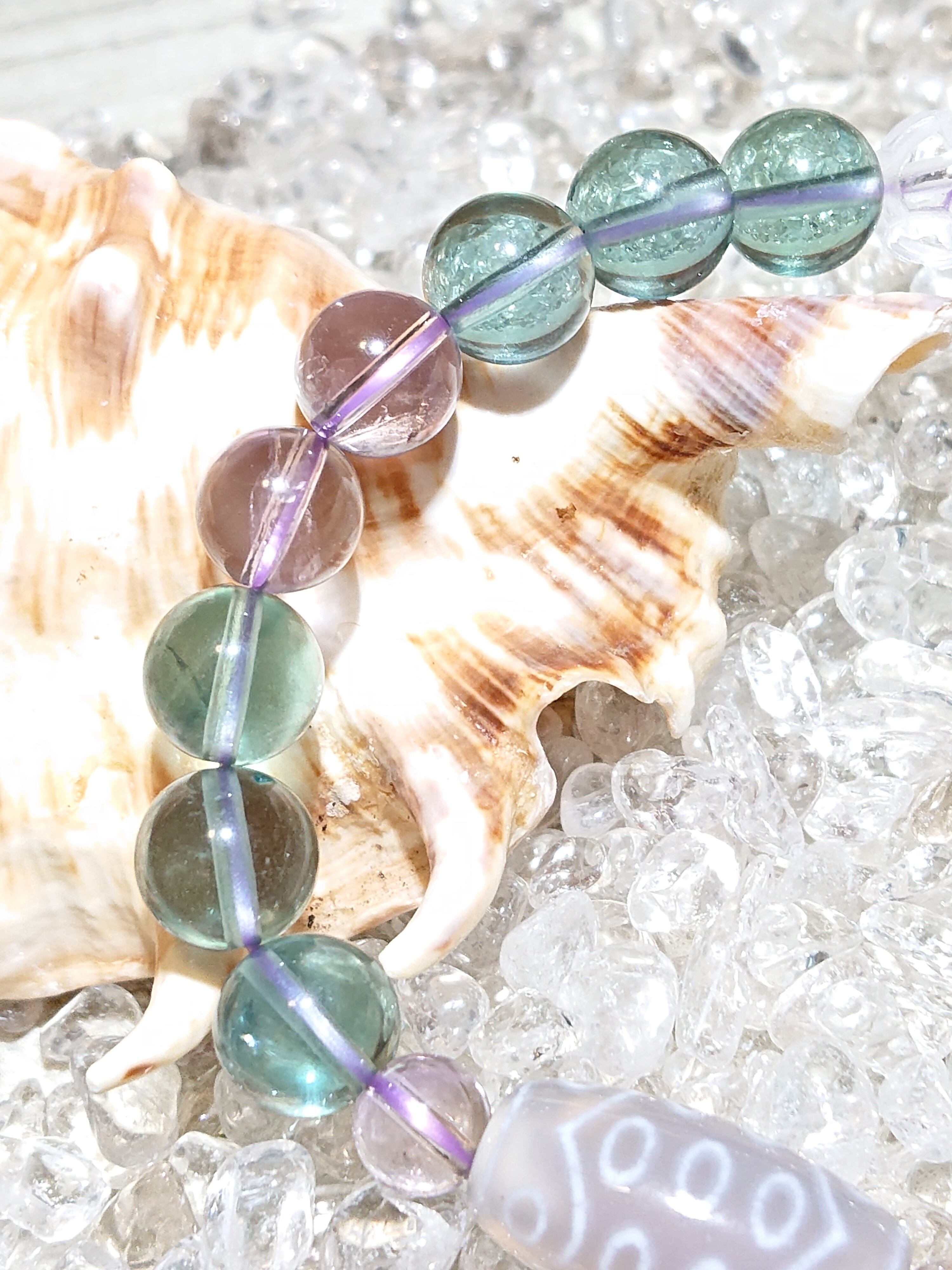 白・二十一眼天珠(チベット老玉髄天珠) 、フローライト(ブルー)、アメトリン、水晶(蓮彫り)